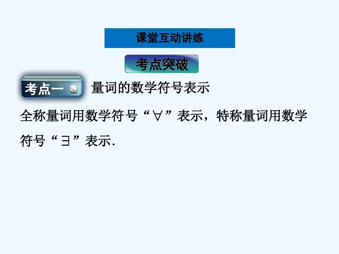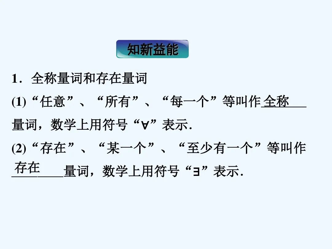 1、全称量词:短语“对所有的”,“对任意的”在陈述中表示整体或全部的含义,逻辑中通常叫做全称量词,并用符号“”表示;