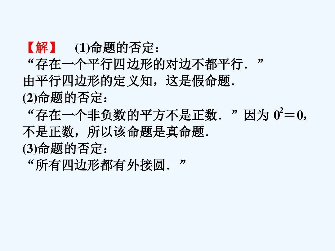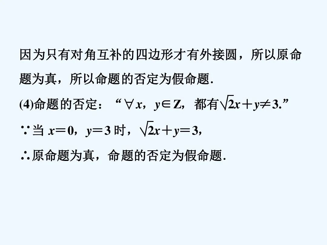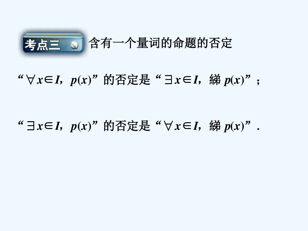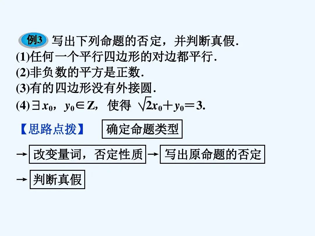 (2)对于省略量词的命题,应先挖掘命题中隐含的量词,改写成含量词的完整形式,再依据规则来写出命题的否定.