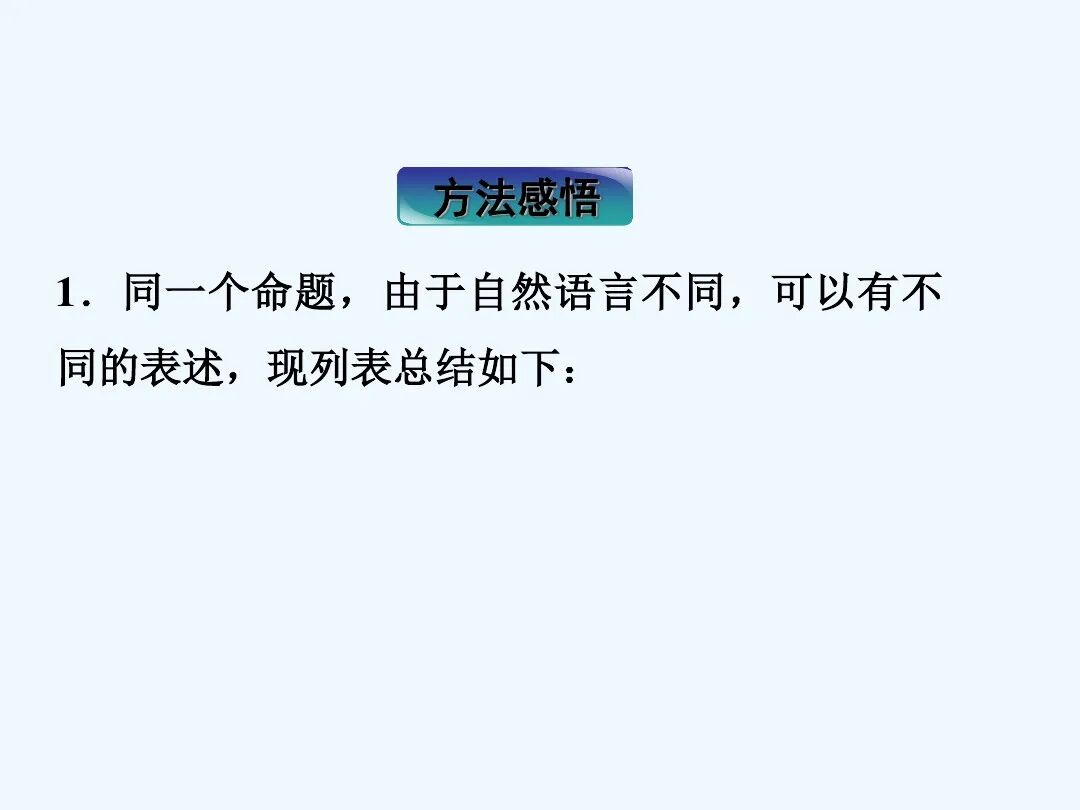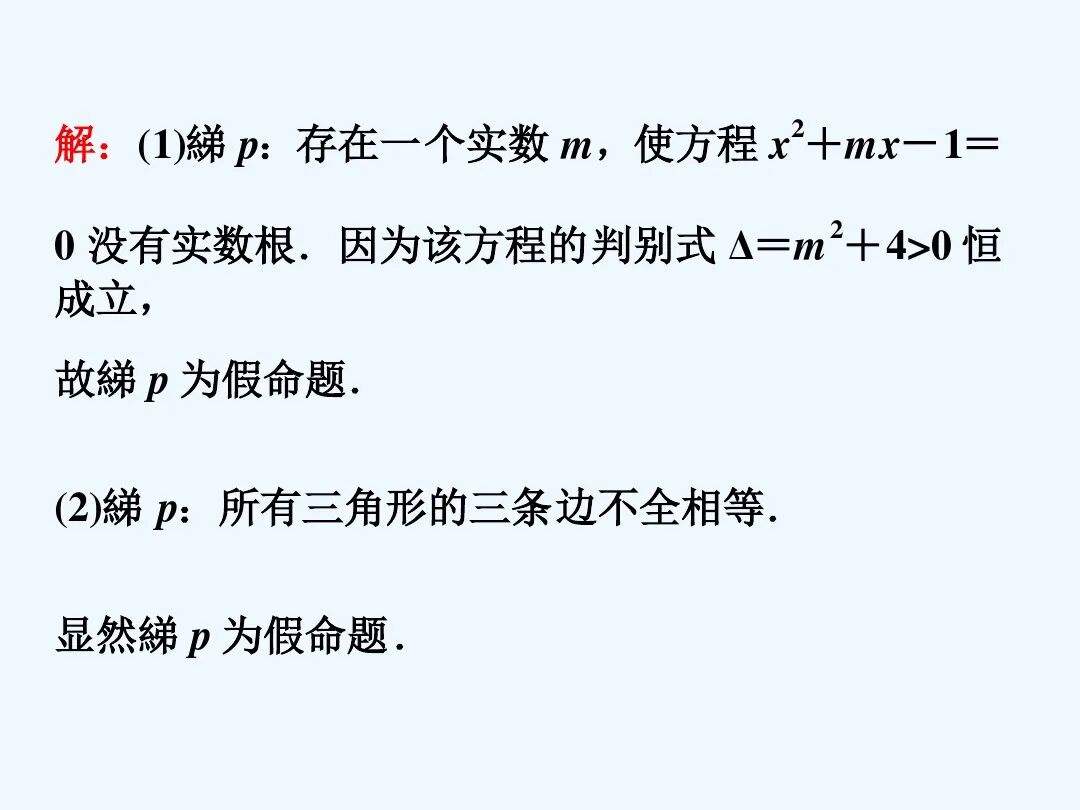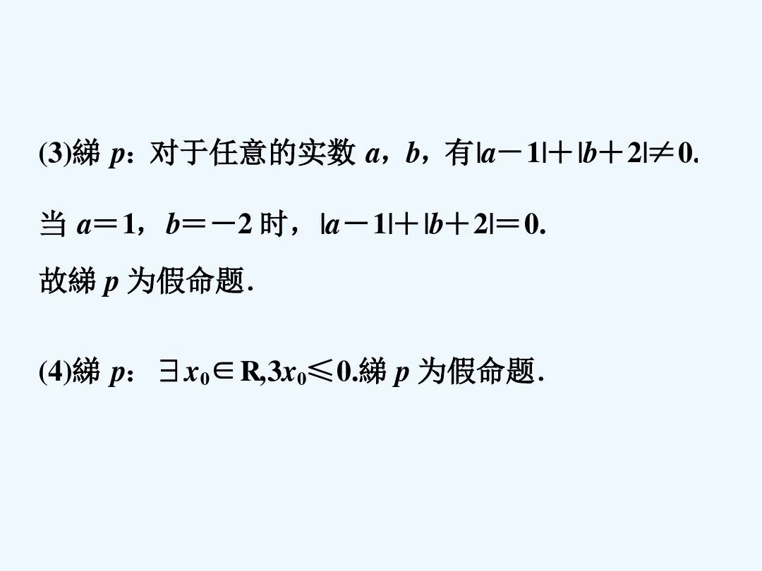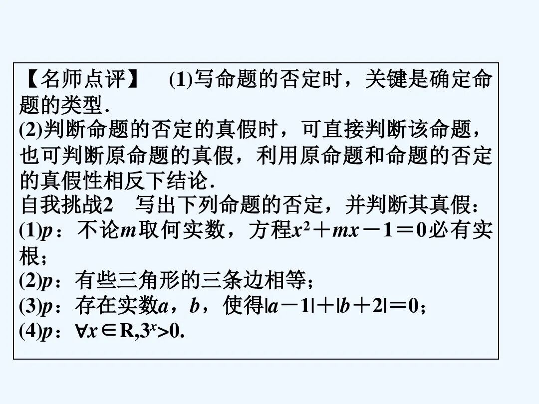 (2)对于省略量词的命题,应先挖掘命题中隐含的量词,改写成含量词的完整形式,再依据规则来写出命题的否定.