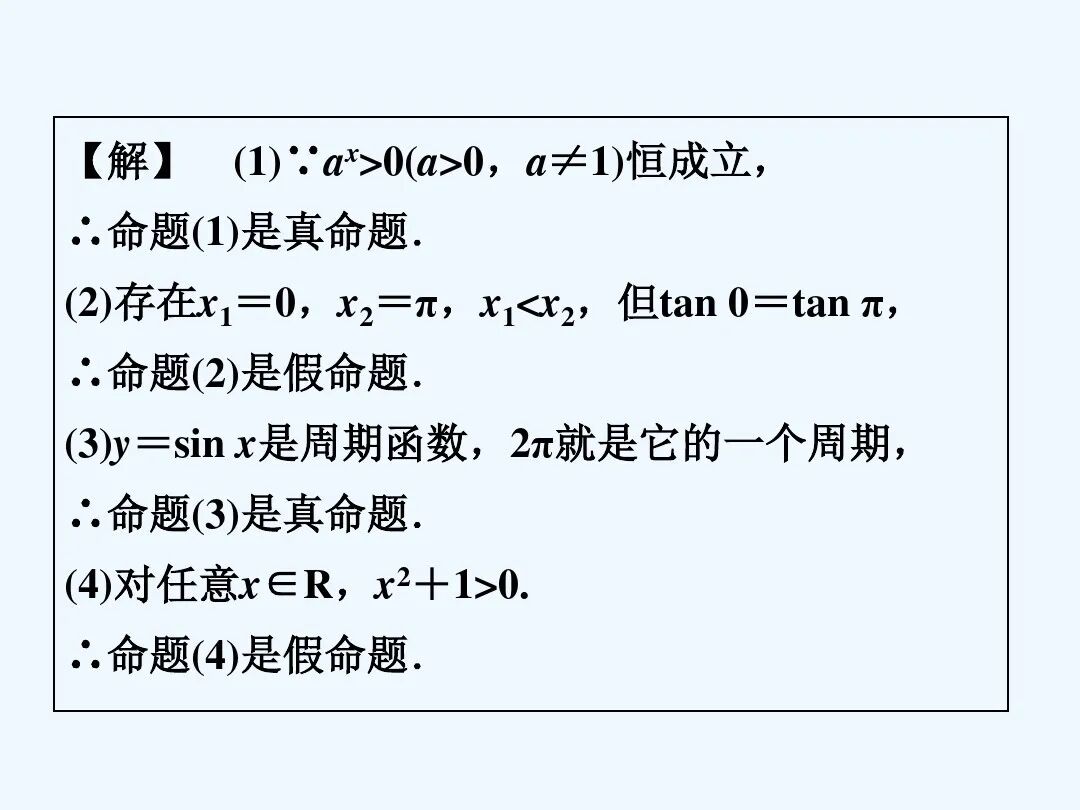 [解](1)是全称量词命题.因为∀x∈N,2x+1都是奇数,所以该命题是真命题.