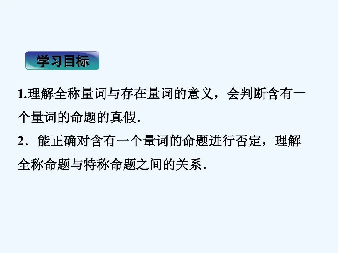 1.通过生活和数学中的丰富实例,理解全称量词与存在量词的意义以及全称量词命题和存在量词命题的意义. 2.掌握全称量词命题与存在量词命题真假性的判定.(重点、难点) 3.能正确地对含有一个量词的命题进行否定.(重点、易混点) | 1.通过含量词的命题的否定,培养逻辑推理素养. 2.借助全称量词命题和存在量词命题的应用,提升数学运算素养. |