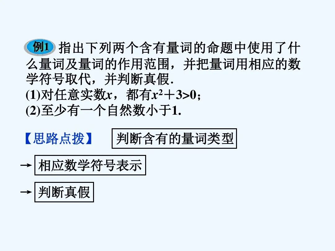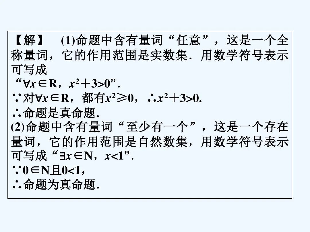 【例1】 指出下列命题是全称量词命题还是存在量词命题,并判断它们的真假.