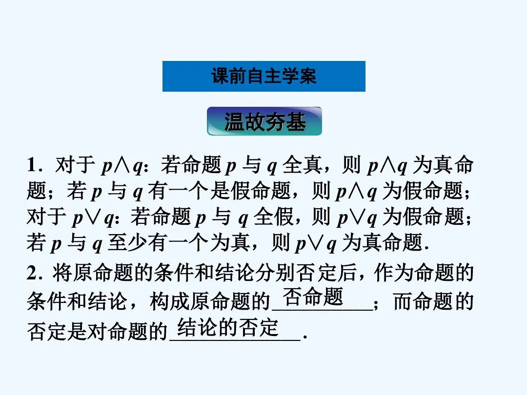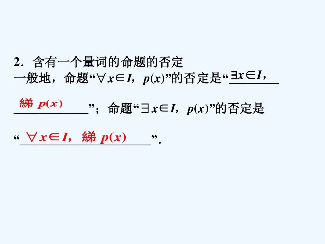 3.全称量词命题与存在量词命题的否定,其模式是固定的,即把相应的全称量词改为存在量词,存在量词改为全称量词,并把命题的结论加以否定.