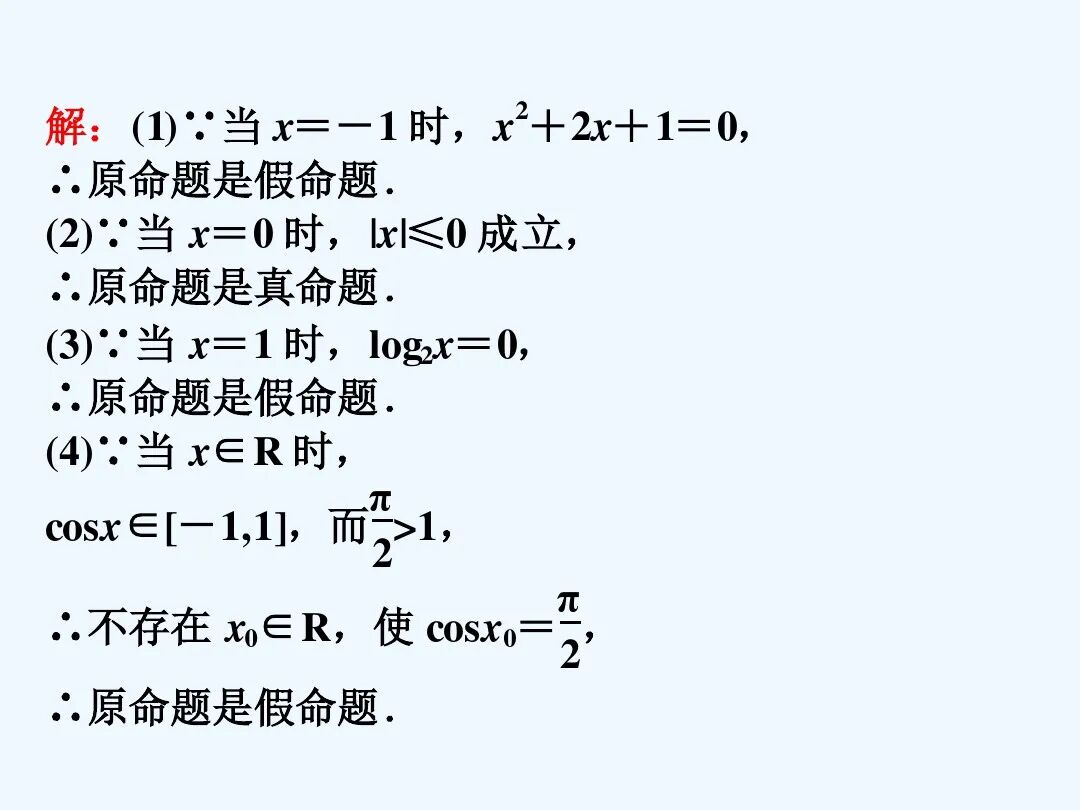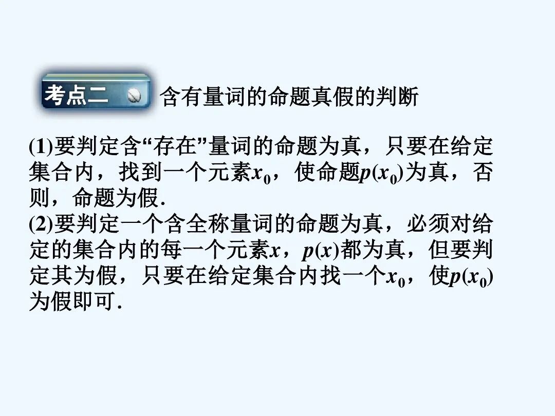2.要判定一个全称量词命题为真命题,必须对限定集合M中的每一个元素x验证p(x)成立,要判定其为假命题,只要举出一个反例即可;对存在量词命题真假的判定方法正好与之相反.