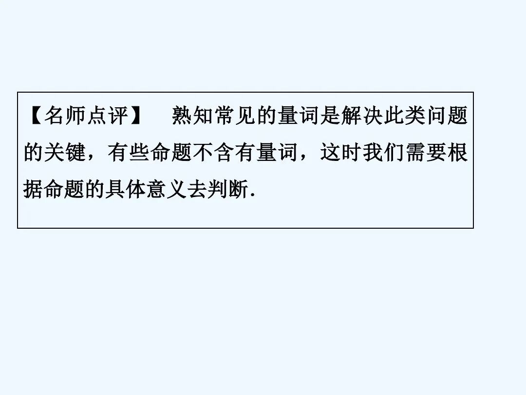 1.判定一个命题是全称量词命题还是存在量词命题的主要方法是看命题中含有哪种量词,判定时要特别注意省略量词的全称量词命题.
