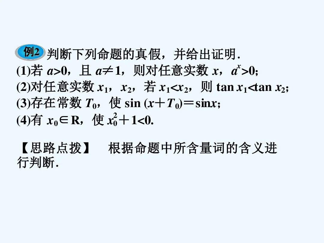 (1)要判定一个全称量词命题是真命题,必须对限定集合M中的每个元素x证明p(x)成立;但要判定全称量词命题是假命题,只要能举出集合M中的一个x,使得p(x)不成立即可(这就是通常所说的“举出一个反例”).