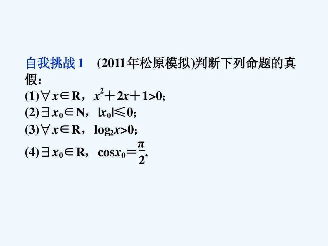 (2)要判定一个存在量词命题是真命题,只要在限定集合M中,能找到一个x使p(x)成立即可;否则,这个存在量词命题就是假命题.