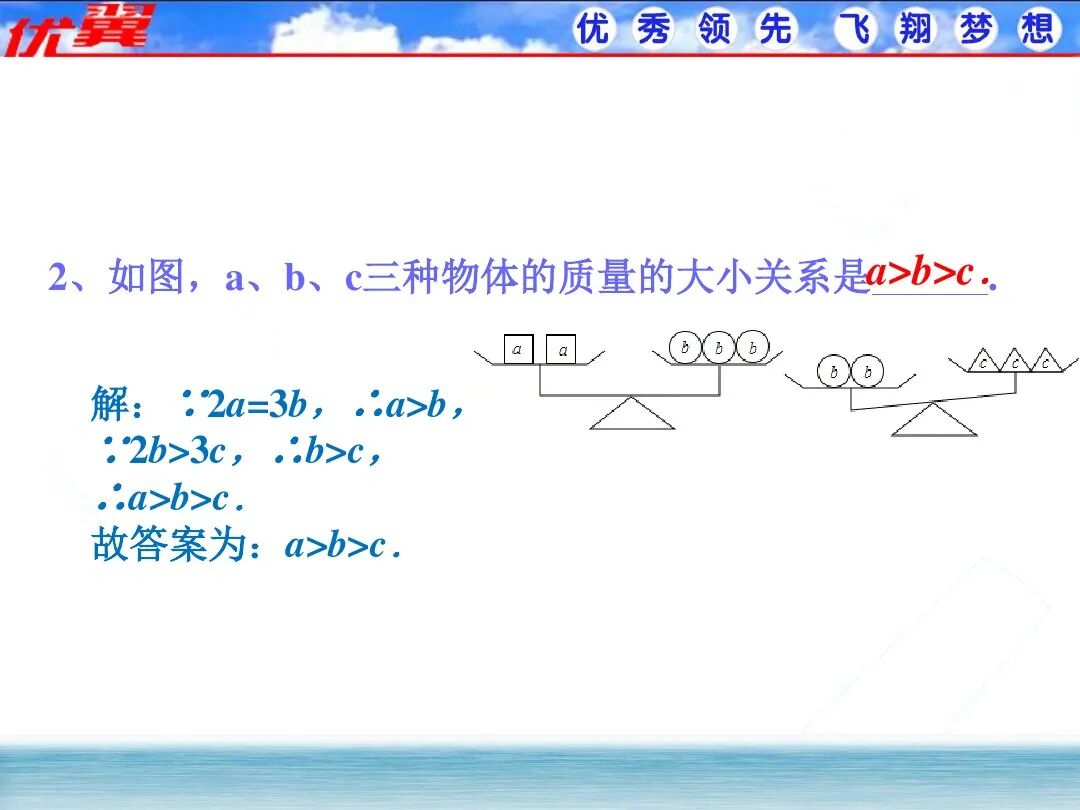 | 创设天平情境问题: 观察课件,说出物体a和c哪个质量更大一些? 由此判断: 如果a>b,b>c,那么a和c的大小关系如何? | 从学生身边的生活经验出发进行新知的学习,有助于调动学生学习的积极性. |