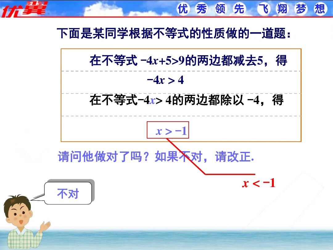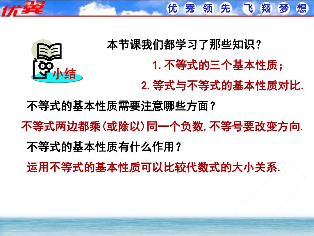 小 结 | 要点:不等式的三条基本性质. 方法:作差比较法. 注意点:不等式的两边同时乘以同一个负数时,不等号的方向必须改变. |