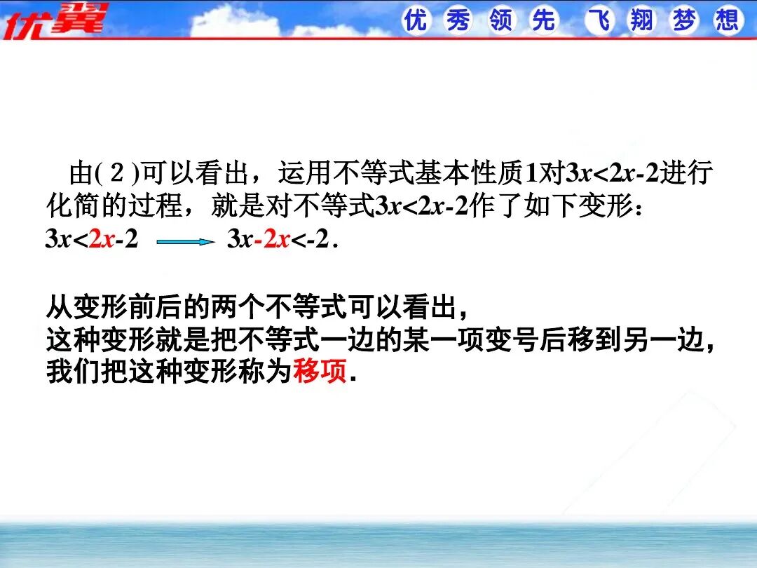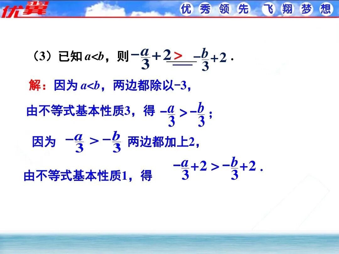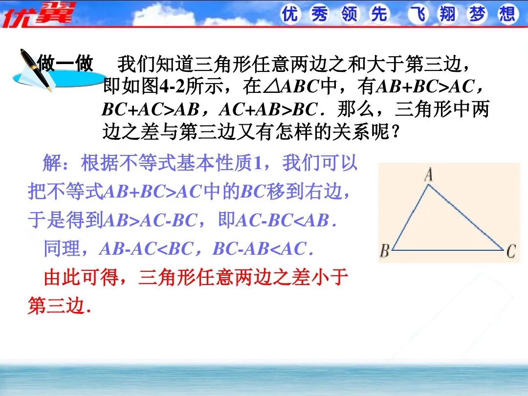 新 课 新 课 新 课 | 性质1(传递性) 如果 a>b,b>c,则 a>c. 分析 要证a>c,只要证 a-c>0. 证明 因为 a-c=(a-b)+(b-c), 又由 a>b,b>c,即 a-b>0,b-c>0, 所以 (a-b)+(b-c)>0. 因此 a-c>0. 即 a>c. 【课件展示情境2】
