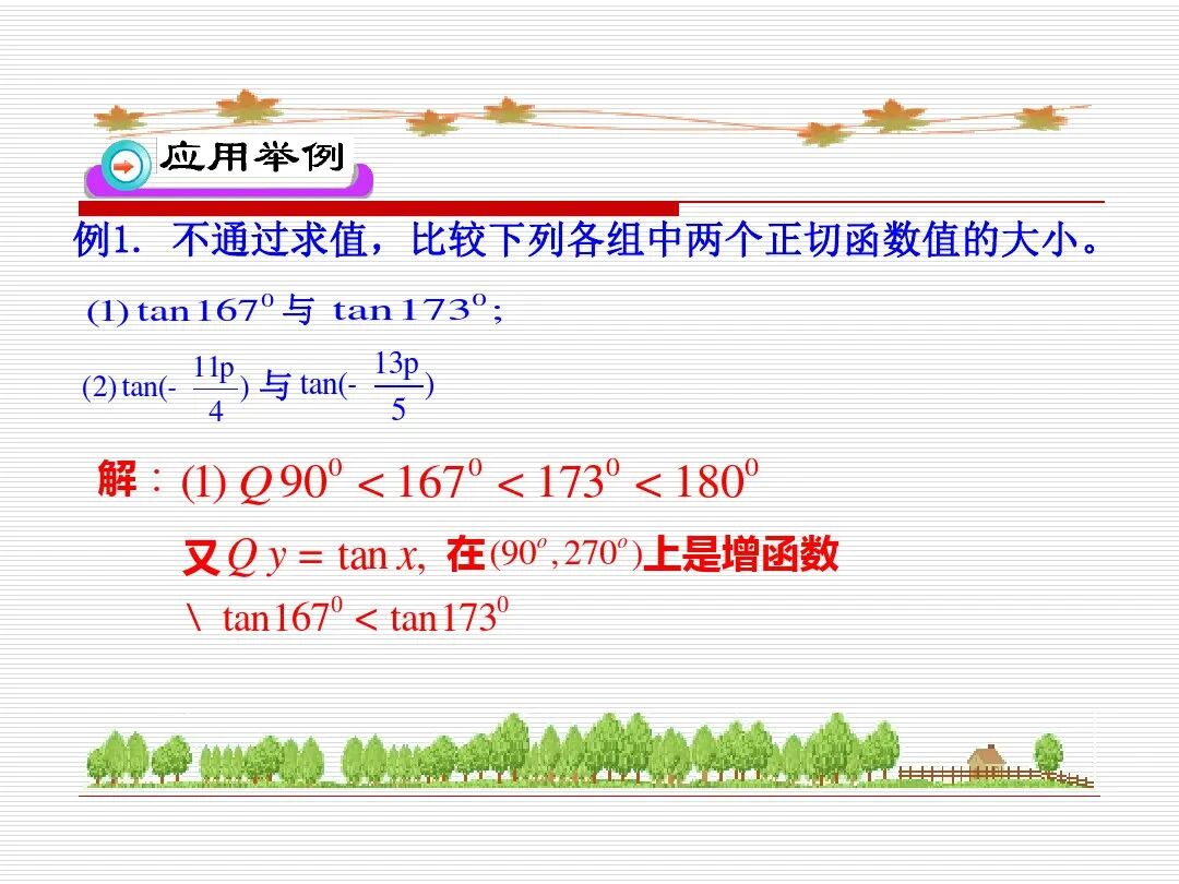语文数学英语物理化学生物史地政治道德与法治美术音乐科学全部课程 ↓知识点:(1)任意角的正切函数:如果角α满足α∈R,α≠π2+kπ(k∈Z),那么,角α的终边与单位圆交于点P(a,b),唯一确定比值ba,我们把它叫作角α的正切函数,记作y=tan α,其中α∈R,α≠π2+kπ,k∈Z.(2)正切函数与正弦、余弦函数的关系:根据定义知tan α=sin αcos α(α∈R,α≠kπ+π2,k∈Z).(3)正切值在各象限的符号:根据定义知,当角在第一和第三象限时,其正切函数值为正;当角在第二和第四象限时,其正切函数值为负.(4)正切线:在单位圆中令A(1,0),过A作x轴的垂线,与角α的终边或终边的延长线相交于T,称线段AT为角α的正切线.(1)y=tan x,x∈R且x≠π2+kπ,k∈Z的图像(正切曲线):(2)正切曲线的特征:正切曲线是由被相互平行的直线x=kπ+π2(k∈Z)隔开的无穷多支曲线组成的.这些直线叫作正切曲线各支的渐近线.视频教学:练习:【例1】 已知角α的终边经过点P(-4a,3a)(a≠0),求sin α,cos α、tan α的值.解 r=-4a2+3a2=5|a|,若a>0,则r=5a,角α在第二象限,sin α=yr=3a5a=35,cos α=xr=-4a5a=-45.tan α=yx=3a-4a=-34;若a<0,则r=-5a,角α在第四象限,sin α=-35,cos α=45,tan α=-34.规律方法 已知角α终边上任一点的坐标(m,n)利用定义求tan α时,其值与该点的位置无关且tan α=nm.但要注意判断角α所在象限.利用定义可求下列特殊角的正切:α0π6π4π32π33π45π6tan α03)313-3-1-3)3【训练1】 若tan α=12,利用三角函数的定义,求sin α和cos α.解 ∵tan α=12>0,∴角α是第一或第三象限角.①若角α是第一象限角,则由tan α=12,角α的终边上必有一点P(2,1),∴r=|OP|=22+12=5.∴sin α=yr=1(5)=5)5,cos α=xr=2(5)=5)5.②若角α是第三象限角,则由tan α=12知,角α的终边上必有一点P(-2,-1),∴r=|OP|=-22+-12=5.∴sin α=yr=-1(5)=-5)5,cos α=xr=-2(5)=-5)5.题型二 正切函数的图像及应用【例2】 利用正切函数的图像作出y=|tan x|的图像并写出使y=3的x的集合.解 ∵当x∈as4alco1(kπ-(π2),kπ)时,y=tan x≤0,当x∈as4alco1(kπ,kπ+(π2))时,y=tan x>0,∴y=|tan x|=-tan x,x∈lc(c](as4alco1(kπ-(π2),kπ)c))),k∈Z.如图所示.使y=3的x的集合为xlc|c (as4alco1(x=kπ±(π3),k∈Z))).规律方法 1.作正切函数的图像时,先画一个周期的图像,再把这一图像向左、右平移.从而得到正切函数的图像,通过图像的特点,可用“三点两线法”,这三点是as4alco1(-(π4),-1),(0,0),as4alco1((π4),1),两线是直线x=±π2为渐近线.2.如果由y=f(x)的图像得到y=f(|x|)及y=|f(x)|的图像,可利用图像中的对称变换法完成;即只需作出y=f(x)(x≥0)的图像,令其关于y轴对称便可以得到y=f(|x|)(x≤0)的图像;同理只要作出y=f(x)的图像,令图像“上不动,下翻上”便可得到y=|f(x)|的图像.【训练2】 (1)函数y=11+tan x的定义域为________.解析 要使该函数有意义,则有1+tan x≠0,π2)k∈Z,即x≠kπ-π4且x≠kπ+π2.答案 xlc|c (as4alco1(x≠kπ-(ππ2),k∈Z))(2)根据正切函数的图像,写出tan x≥-1的解集.解 作出y=tan x及y=-1的图像,如下图.∴满足此不等式的x的集合为xlc|c (as4alco1(-(ππ2)+kπ,k∈Z)).课件:教案:【教学目标】1.掌握正切函数的定义.2.会求特殊角的正切值.【教学重难点】正切函数的定义域.【教学过程】一、基础铺垫1.正切函数的定义(1)任意角的正切函数根据函数的定义,比值是x的函数,称为x的正切函数,记作y=tanx,其中x∈R,x≠π2+kπ,k∈Z.(2)正切函数与正弦、余弦函数的关系根据定义知tanx=,x∈R,x≠π2+kπ,k∈Z.(3)正弦、余弦、正切都是以角为自变量,以单位圆上点的坐标或坐标的比值为函数值的函数,我们统称它们为三角函数.二、合作探究【例1】已知角α的终边经过点P(-4a,3a)(a≠0),求sinα、cosα、tanα的值.【解】r= -4a2+3a2=5|a|,若a>0,则r=5a,角α在第二象限,sinα=yr=3a5a=35,cosα=xr=-4a5a=-45.tanα=yx=3a-4a=-34;若a<0,则r=-5a,角α在第四象限,sinα=-35,cosα=45,tanα=-34.【教师小结】已知角α终边上任一点的坐标(x,y)利用定义求tanα时,其值与该点的位置无关且tanα=y/x.但要注意判断角α所在象限.利用定义可求下列特殊角的正切:α0π6π4π32π33π45π6tanα03)313-3-1-3)3【活学巧用】已知角α的终边经过点(3,-1),则角α的最小正值是( )A.2π3 B.11π6C.5π6 D.3π4解析:点(3,-1)在第四象限,tanα=-3)3,∴α的最小正值为11π6.【例2】求函数y=11+tanx的定义域.【错解】∵1+tanx≠0,即tanx≠-1.∴x≠kπ-π4,k∈Z.即y=11+tanx的定义域为xlc|c}(as4alco1(x≠kπ-(π4),k∈Z))).【错因分析】错解忽略了y=tanx本身的定义域.【正解】由题意得1+tanx≠0,π2),k∈Z,故函数的定义域为xlc|c}(as4alco1(x≠kπ+(ππ4),k∈Z)).二、课堂练习1.tan 300°的值为( )A.3 B.-3C.3)3 D.-3)3解析: tan 300°=tan(180°+120°)=tan 120°=tan(180°-60°)=-tan 60°=-3;或tan 300°=tan(360°-60°)=-tan 60°=-3.2.在平面坐标系中,︵,︵,︵,︵是圆x2+y2=1上的四段弧(如图),点P在其中一段上,角α以Ox为始边,OP为终边,若tanα<cos< span="">α<sin< span="">α,则P所在的圆弧是( )</sin<></cos<>A.︵ B.︵ C.︵ D.︵解析:逐个分析A.B.C.D四个选项,利用三角函数的定义可得正确结论.当点P在︵上时,cosα=x,sinα=y,∴cosα>sinα,故A选项错误;当点P在︵上时,cosα=x,sinα=y,tanα=yx,∴tanα>sinα>cosα,故B选项错误;当点P在︵上时,cosα=x,sinα=y,tanα=yx,∴sinα>cosα>tanα,故C选项正确;当点P在︵上且︵在第三象限时,tanα>0,sinα<0,cos< span="">α<0,故d选项错误.综上,故选c.< span="">3.函数f(x)=tan 2xtan x的定义域为________.解析:函数应满足2x≠kπ+(π2π2tan x≠0(k∈Z),即x≠(kππ4π2x≠kπ(k∈Z),所以x≠kπ4,k∈Z.4.已知角α的顶点在原点,始边与x轴的正半轴重合,终边落在直线y=-2x上,x≥0,求tan
