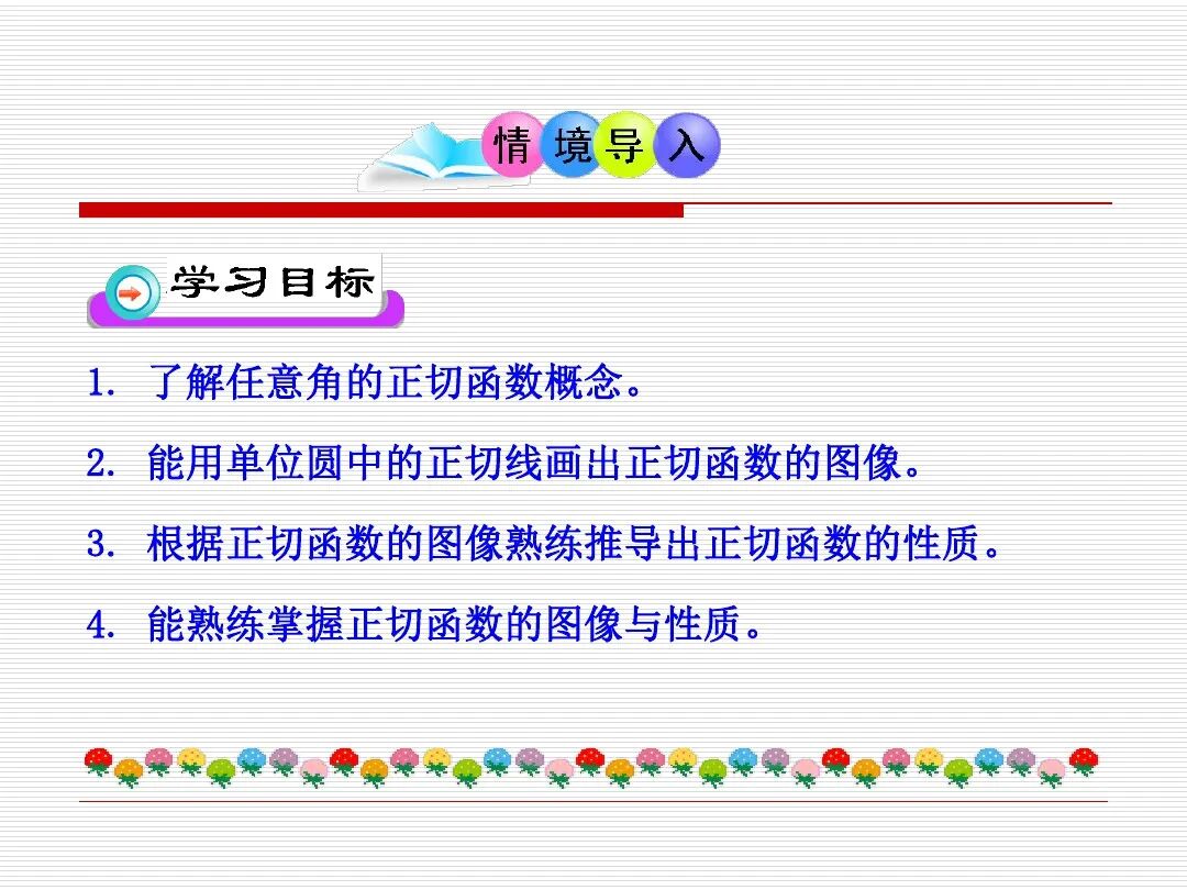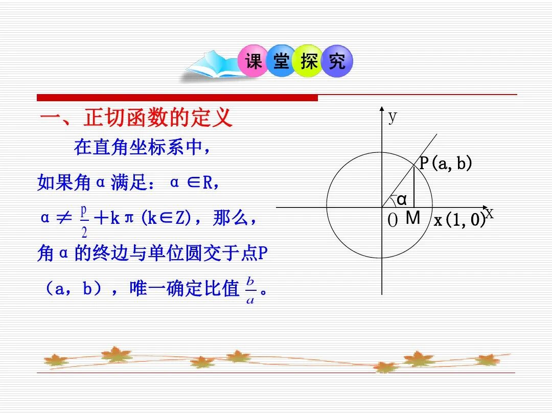如果角α满足α∈R,α≠π2+kπ(k∈Z),那么,角α的终边与单位圆交于点P(a,b),唯一确定比值ba,我们把它叫作角α的正切函数,记作y=tan α,其中α∈R,α≠π2+kπ,k∈Z.