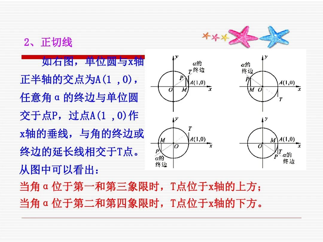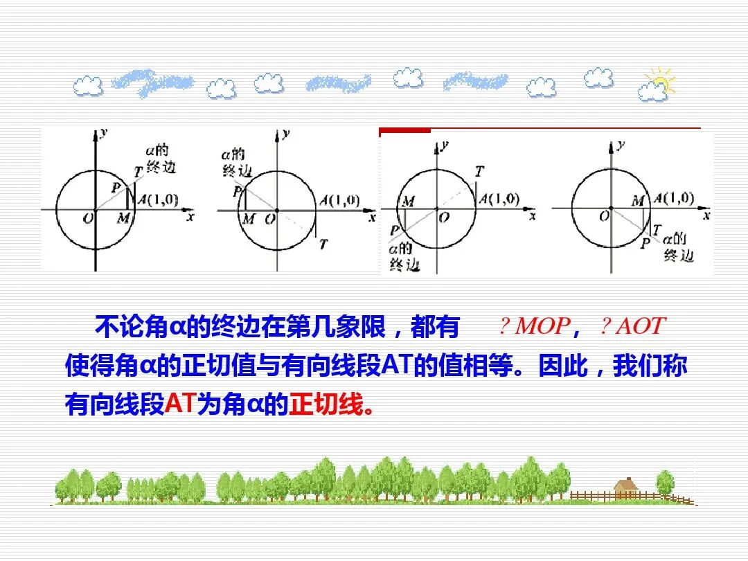在单位圆中令A(1,0),过A作x轴的垂线,与角α的终边或终边的延长线相交于T,称线段AT为角α的正切线.