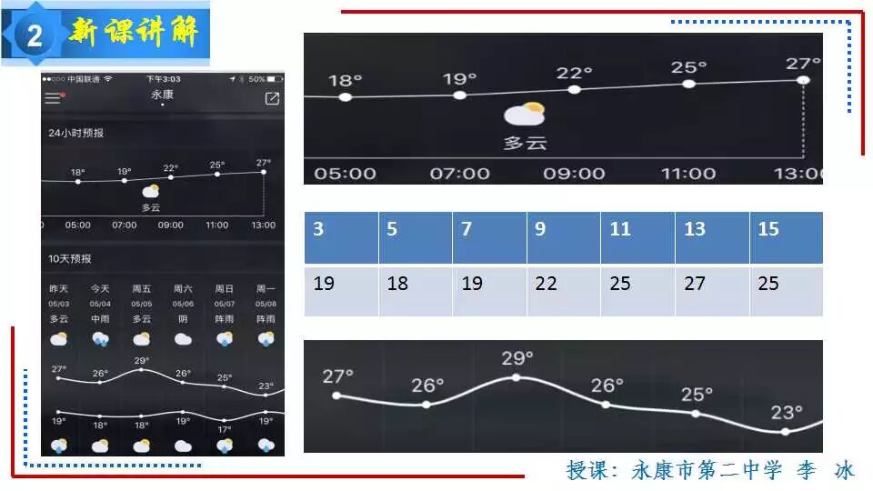 2.《数学课程标准》在实施建议中指出:“义务教育阶段的数学课程,应强调从学生已有的生活经验出发,让学生亲身经历将实际问题抽象成数学模型并进行解释与应用的过程。”例题1是天气变化与三角函数问题,本节课在完成基本求解任务的基础上,还通过实际数据对例题进行应证,使得学生有更强的现实感。例题2是潮汐现象与三角函数问题,通过对例题的分析,我们会发现其具有很重要的现实意义与应用价值。通过教师课前的数据采集和梳理的学习任务分配和课后的作业设计,让学生的数学学习过程不仅仅局限于课中,而拓展至课外的实践交流分享最终达到解决的过程。