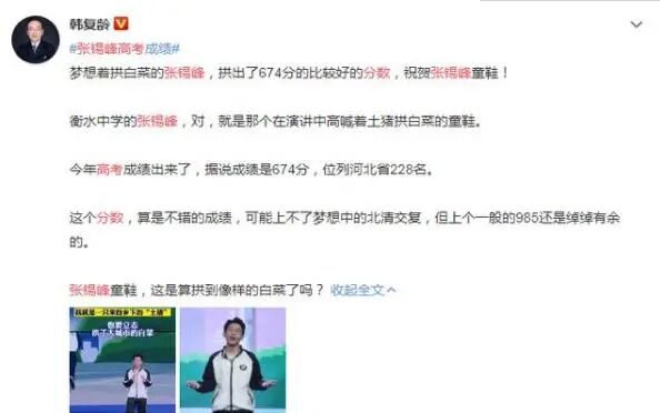语文数学英语物理化学生物史地政治道德与法治美术音乐科学全部课程 ↓“我就是一只来自乡下的土猪,也要立志去拱了大城市里的白菜”。前一段时间,一条衡水中学学生的演讲在网络上悄然走红,这位学生也成为了不少人讨论的对象,而他走红各大社交平台的原因也是因为他的那句“乡下土猪”。这位来自衡水中学的学生名字叫张锡峰,他在一次公开的演讲当中,情绪激昂充满斗志,同时也鼓励了不少的高考考生努力拼搏。但他却将自己比喻成“乡下土猪”,他说他立志要供了大城市的白菜。这句话在不同人的眼中也代表了不同的含义,一些人觉得这是一种激励,也有一些人觉得他的怨气太重。其实,在张锡峰同学走红之后我也看过他的演讲视频,我觉得他的演讲当中并没有大家所说的那么怨气深重,反而是更能激起学生的斗志,也希望大家能够理性对待。那位自称是“乡下土猪”的学生,高考成绩被曝光因为这是他在高考之前的演讲,现在高考已经结束了,自然大家对于他的高考成绩也是非常的好奇。在河北省公布成绩的当天,就有不少网友开始好奇了。而最近就有网友在网络上曝光了张锡峰的高考成绩,不少网友在看到这样的成绩之后,对于张锡峰同学还是很钦佩的,不少想要看笑话的网友也没了声音。据知情人透露,张锡峰在今年的高考当中成绩也是比较理想的:总分674分,在整个河北省的排名为228名。这样的成绩在河北省来说虽然算不上拔尖,也不一定能考得上清华北大上交复旦,但想要报考一个差不多的985高校还是绰绰有余的。网友们也在调侃,张锡峰同学现在也算是拱到了大城市的白菜。我们也要祝贺一下张锡峰同学也算是实现了自己的目标,也祝愿他能够拥有更加广阔的未来吧!虽然说网络上现在还存在对于张锡峰的一些质疑声音,甚至还有人说他高考还被家长开车接走,并不符合寒门学子的形象,而且能进入衡水中学学习的家庭条件应该都很不错。但我觉得张锡峰发表那次的演讲最重要的还是为了激励自己,而并没有网友们想象中的那么复杂。也希望大家对于他不要抱有太大的敌意,谁年轻的时候还没说过几句狠话呢?而作为衡水中学的“十大年度人物”,因为张锡峰的言论也使得衡水中学再次被不少网友讨论,尤其是衡水中学的教育模式也成为了不少网友讨论的焦点。衡水中学的教育模式再次引发网友讨论相信不少同学虽然没有上过衡水中学,但是大多都做过衡水中学的试卷吧?衡水中学作为国内有名的高考加工厂,其凭借独特的教学模式培养出了不少的高分考生。但衡水中学的教学模式也是饱受争议,在了解完衡水中学的教育模式之后,也会发现衡水中学在培养人才上,多是半军事化管理,也有网友调侃是在培养考试机器。但对于目前的应试教育来说,衡水中学的教学模式还是很成功的。也帮助不少考生成功考入了理想的院校,为考生争取来了更美好的未来。如果说衡水中学是在培养考试机器这件事情确实不能否认,学生们在任何时候都是以学习为主,不管是吃饭、下课、跑操、甚至是上厕所,每个学生人手一本书。但这也说明了衡水中学在管理学生方面还是很规范的,也相信这也能够帮助学生们培养更好的生活习惯。所以我觉得大家也没必要去批评衡水中学的教学模式,这也是在顺应教育发展。作为学生当下最主要的任务就是提升学习成绩,争取在高考当中取得好成绩。只有这样才能让自己的未来拥有更加广阔的发展空间,在人生当中也会多出更多的选择。也希望每一位考生在自己的努力之下,都能考入最理想的高校。写在最后:其实不管是张锡峰“乡下土猪”的言论,还是衡水中学的教学模式,这都是当下教育的一种体现。大家一定要理性对待,不要用自己的想法去否定别人。张锡峰同学的发言可能确实会引起一些人的不适,但是他身上确实也有一种冲劲。至于他所说的自己是寒门学子,我觉得这只是一场演讲,演讲的主要目的就是为了激励更多的人,他自己可能也会对其有一定的修饰成分在。高中生学习推荐:高中语文(微课+课件+教案+考点)汇总高中英语(微课+课件+教案+考点)汇总高中化学(微课+课件+教案+考点)汇总高中物理(微课+课件+教案+考点)汇总高中数学(微课+课件+教案+练习题)汇总高中生物(微课+课件+教案+练习题)汇总高中历史(必修+选修)微课精讲+考点汇总高中政治(必修+选修)微课精讲+考点汇总高中地理(必修+选修)微课精讲+考点汇总图文来自网络,版权归原作者,如有不妥,告知即删点击阅读原文下载全册PPT课件动画教案习题整套资料