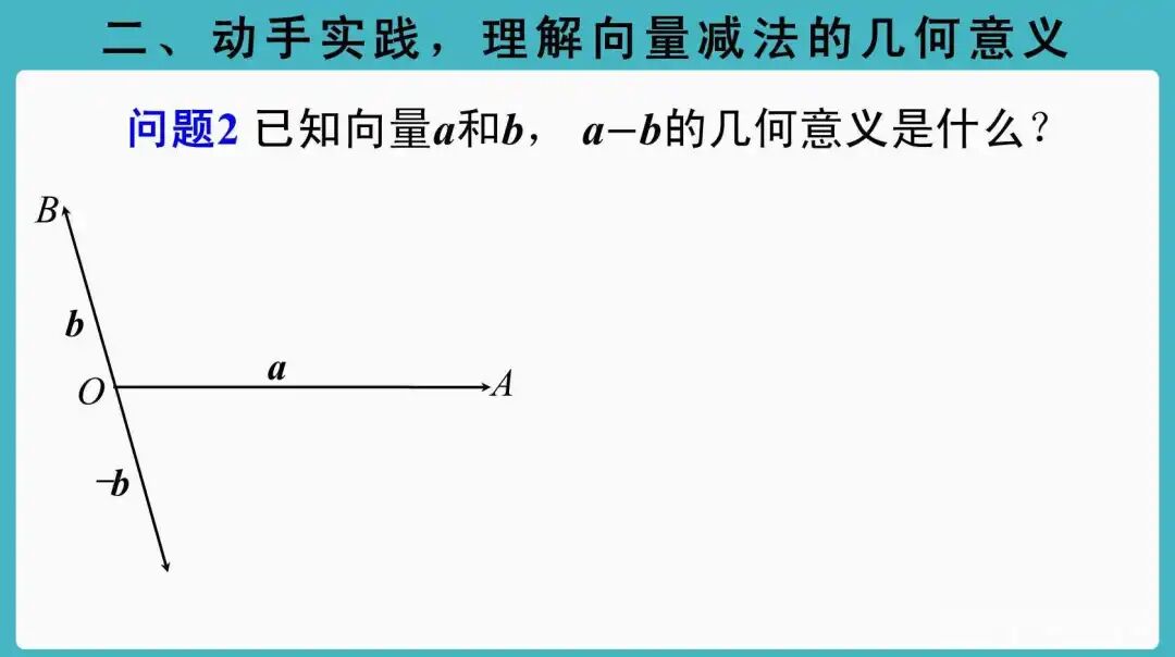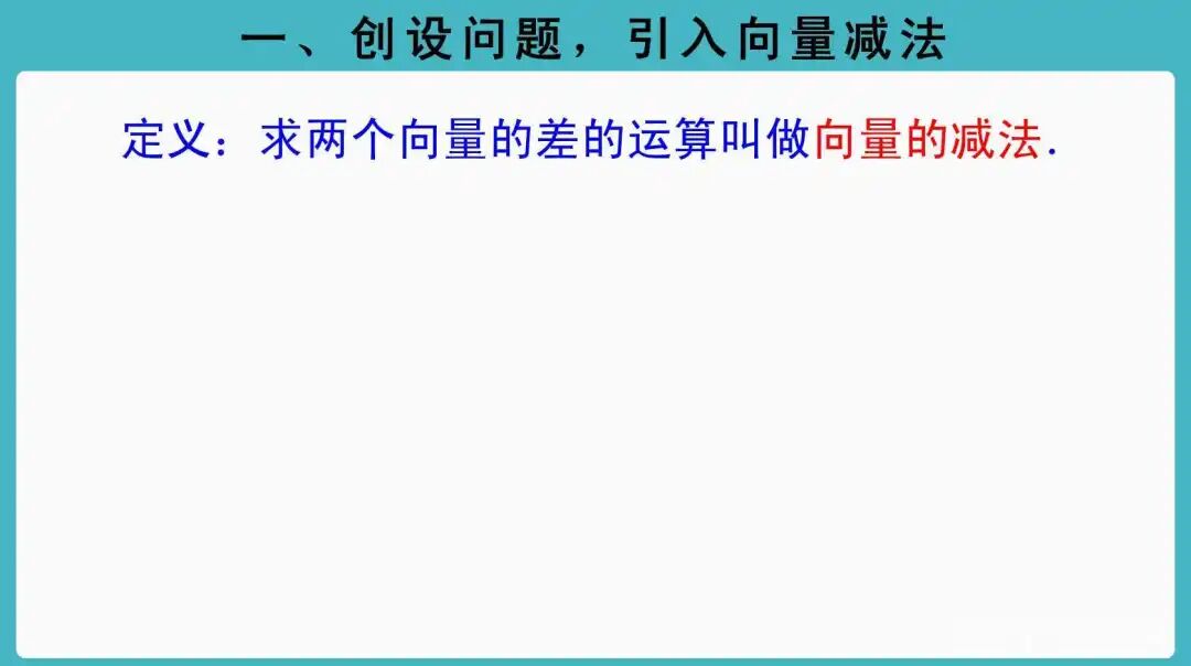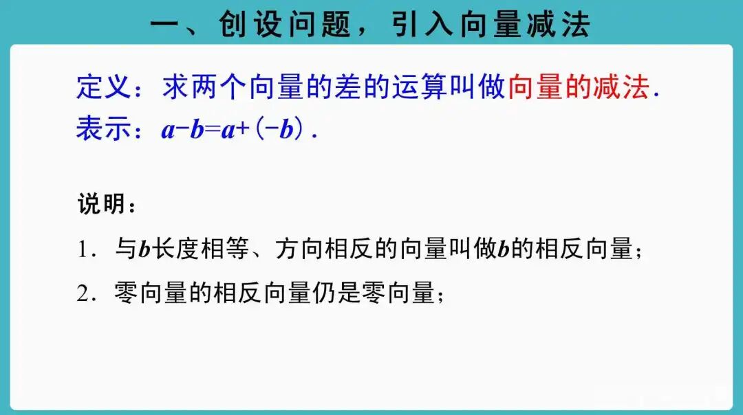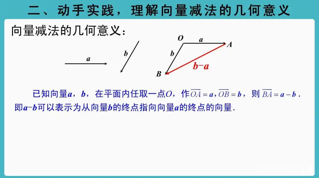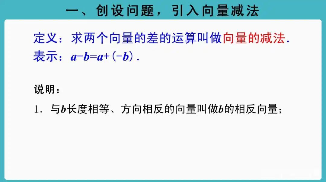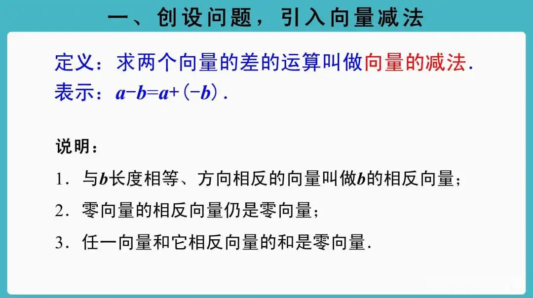 1. 理解并掌握向量的减法运算并理解其几何意义,理解相反向量.
