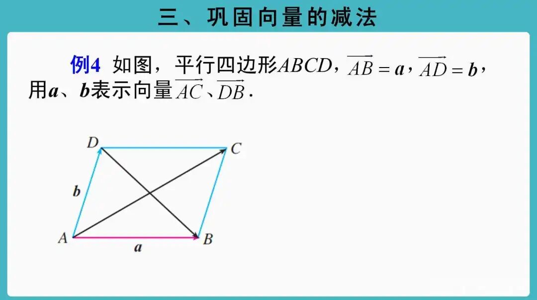 3.已知□ABCD,=a,=b,试用向量 a 和 b 分别表示以下向量 (1) ; (2) . | 教师引导学生由向量加法得到向量减法. 学生比较向量加法的三角形法则与向量减法的作图法则的不同,总结规律. 师生合作完成. 师生合作完成. 教师作图,引导学生完成证明: a-b=a+(-b) 教师给出问题. 学生根据向量的加法运算和减法运算完成解答. 教师给出问题. 学生作图解答. 教师结合学生解答情况纠错总结. 学生练习巩固. | 在向量加法的基础上引入减法定义和作图法则,符合学生认知规律,有利于减法运算的掌握. 比较学习,印象深刻. 有向量加法的基础,学生解决这类习题应该更轻松,所以建议由学生为主教师为辅来完成.但向量加法运算和减法运算又有不同,在加法知识先入为主的思维障碍下,有些学生加减法会混淆,所以教师一定要引导学生来区分两者,加深印象. 平行四边形是向量运算中经常遇到的图形,此题作为重点让学生熟练掌握. 练习中作图与化简两类题型都要练到,使学生对减法法则认识更加深刻. |