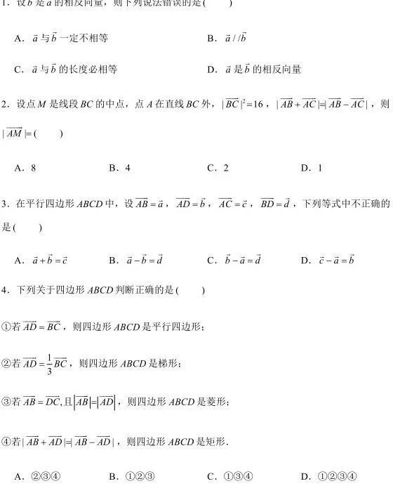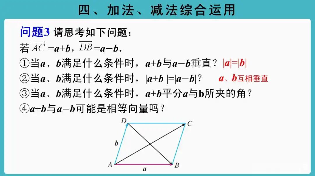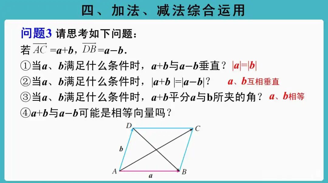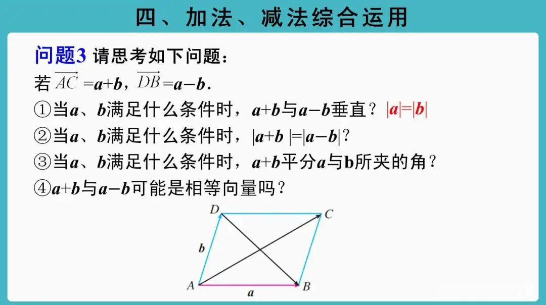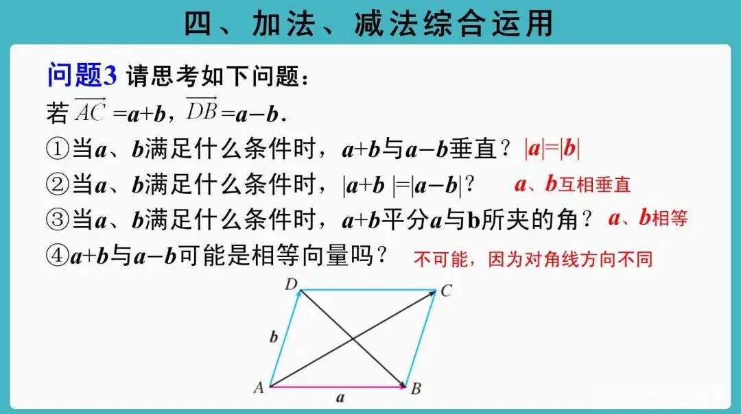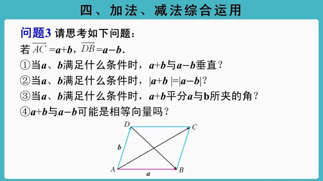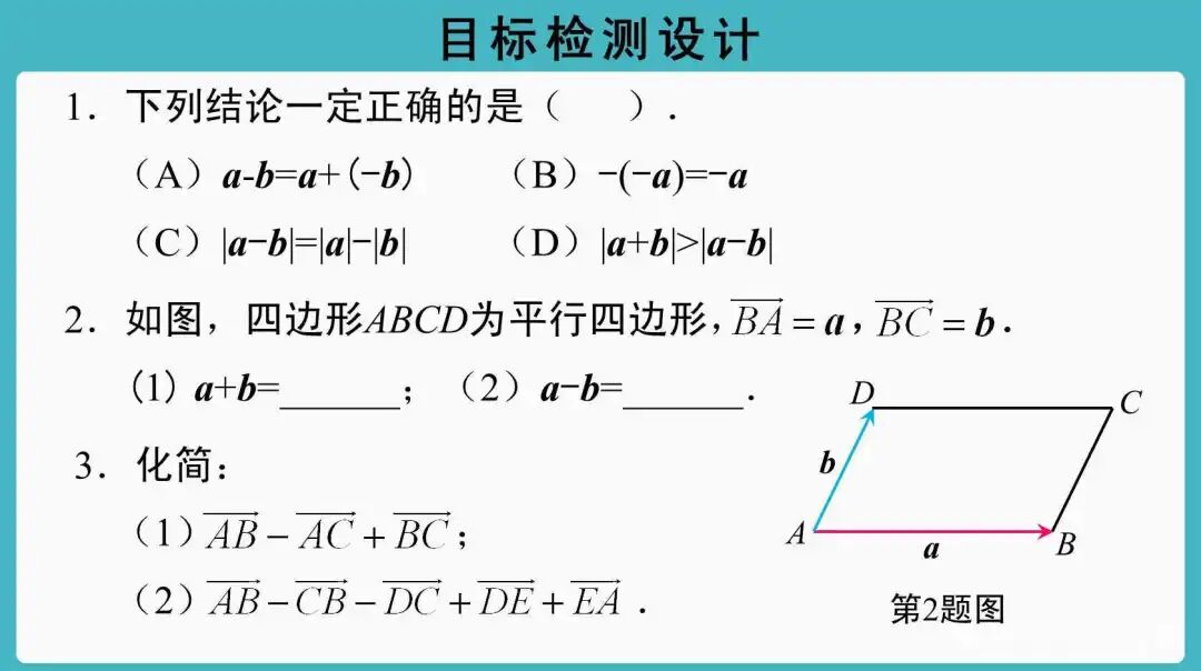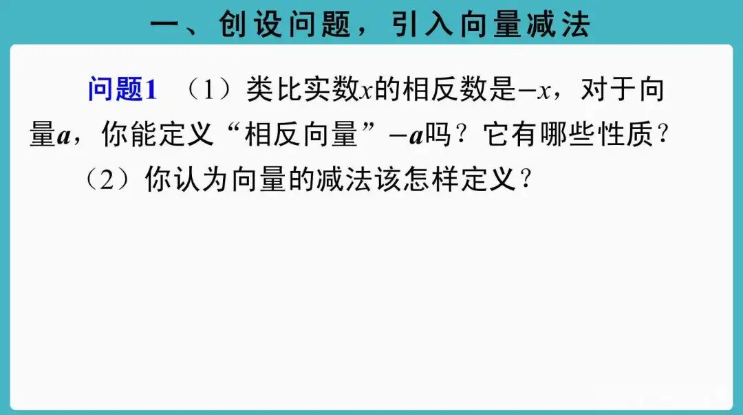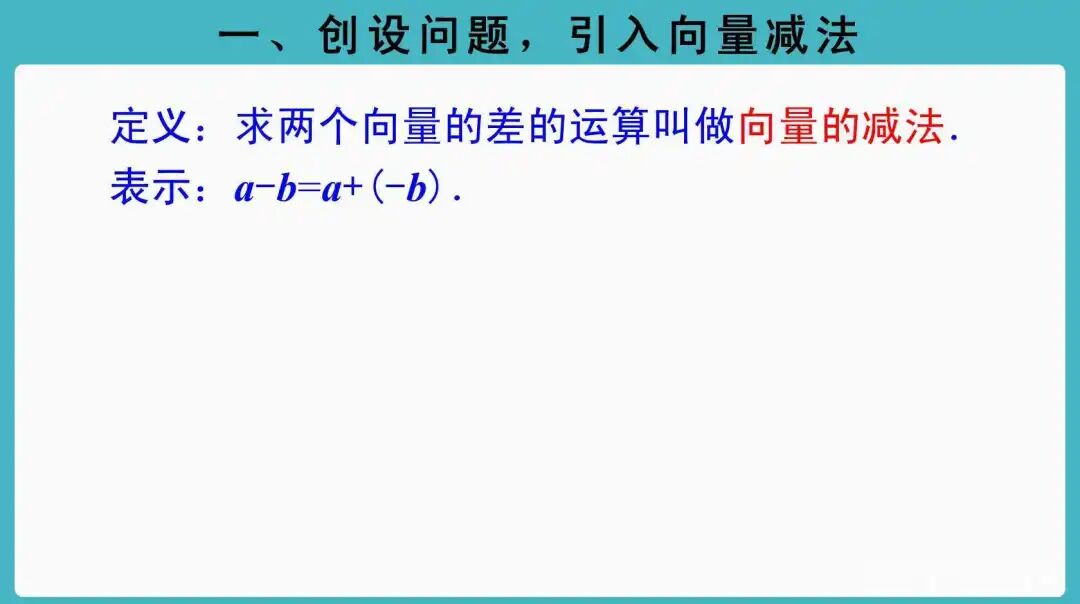 语文数学英语物理化学生物史地政治道德与法治美术音乐科学全部课程 ↓知识点:(1)视频教学:练习:课件:教案:【教学目标】1. 理解并掌握向量的减法运算并理解其几何意义,理解相反向量.2. 通过教学,养成学生规范的作图习惯,培养学生数形结合的思想方法.【教学重点】向量减法的三角形法则.【教学难点】理解向量减法的定义.【教学方法】这节课主要采用启发式教学和讲练结合的教学方法.由实例引入,创设问题情境,教师引导学生由向量加法得到向量减法.并在教学过程中始终注重数形结合,对比教学,使问题处于学生思维的最近发展区,较好地培养学生发现问题、提出问题、解决问题的能力.【教学过程】环节教学内容师生互动设计意图导入在某地的一条大河中,水流速度为v1,摆渡船需要以v2的实际航速到达河对岸,那么摆渡船自身应以怎样的航行速度行驶呢?教师提出问题,引入课题.学生思考.从实际生活经历出发,激发学生的学习兴趣,同时体现向量的应用价值. 新课 新课 新课 1.向量减法法则已知向量 a,b,作 =a,=b,则由向量加法的三角形法则,得b+=a,我们把向量叫做向量 a 与 b 的差,记作 a-b,即=a-b=-.两个向量的差是减向量的终点到被减向量的终点的向量.当两个向量同向时当两个向量反向时2.相反向量与向量 a 等长且方向相反的向量叫做 a 的相反向量,记作-a.思考:向量减法是加法运算的逆运算吗?例1 已知□ABCD,=a,=b, 试用向量 a 和 b 分别表示向量和 .解 连接 AC,DB,由向量求和的平行四边形法则,有=+=a+b;由减法定义,得=-=a-b. 例2 已知向量 a,b,c与d,求作向量a-b,c-d.解 在平面内任取一点 O,作 =a,=b,作向量,则a-b=-=.作=c,=d,作向量,则c-d= -=. 练习 1.已知向量a、b,求作向量a-b.2.如图是平行四边形,化简:3.已知□ABCD,=a,=b,试用向量 a 和 b 分别表示以下向量(1) ; (2) . 教师引导学生由向量加法得到向量减法. 学生比较向量加法的三角形法则与向量减法的作图法则的不同,总结规律. 师生合作完成. 师生合作完成. 教师作图,引导学生完成证明:a-b=a+(-b) 教师给出问题.学生根据向量的加法运算和减法运算完成解答. 教师给出问题. 学生作图解答. 教师结合学生解答情况纠错总结. 学生练习巩固. 在向量加法的基础上引入减法定义和作图法则,符合学生认知规律,有利于减法运算的掌握. 比较学习,印象深刻. 有向量加法的基础,学生解决这类习题应该更轻松,所以建议由学生为主教师为辅来完成.但向量加法运算和减法运算又有不同,在加法知识先入为主的思维障碍下,有些学生加减法会混淆,所以教师一定要引导学生来区分两者,加深印象. 平行四边形是向量运算中经常遇到的图形,此题作为重点让学生熟练掌握. 练习中作图与化简两类题型都要练到,使学生对减法法则认识更加深刻.小结1.向量的减法法则.2.相反向量.师生合作.梳理总结也可针对学生薄弱或易错处进行强调和总结.高中生学习推荐:高中语文(微课+课件+教案+考点)汇总高中英语(微课+课件+教案+考点)汇总高中化学(微课+课件+教案+考点)汇总高中物理(微课+课件+教案+考点)汇总高中数学(微课+课件+教案+练习题)汇总高中生物(微课+课件+教案+练习题)汇总高中历史(必修+选修)微课精讲+考点汇总高中政治(必修+选修)微课精讲+考点汇总高中地理(必修+选修)微课精讲+考点汇总图文来自网络,版权归原作者,如有不妥,告知即删点击阅读原文下载全册PPT课件动画教案习题整套资料