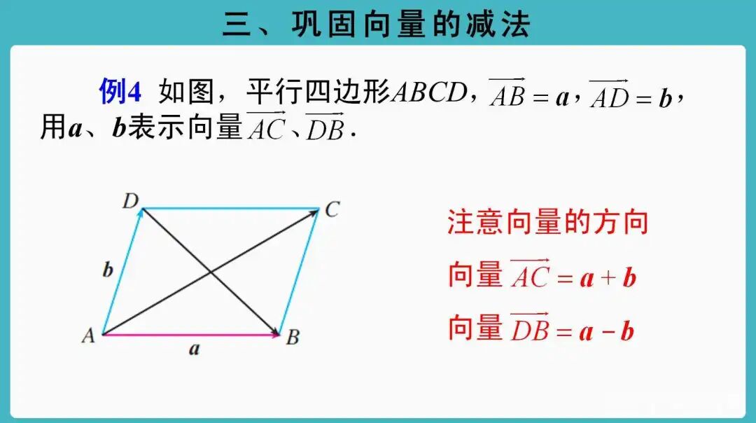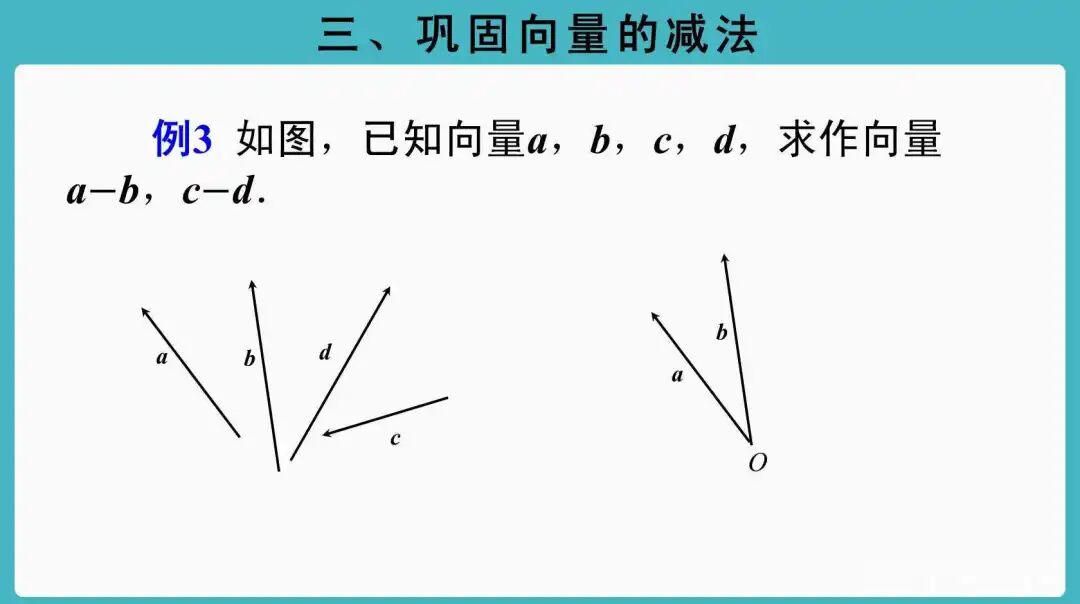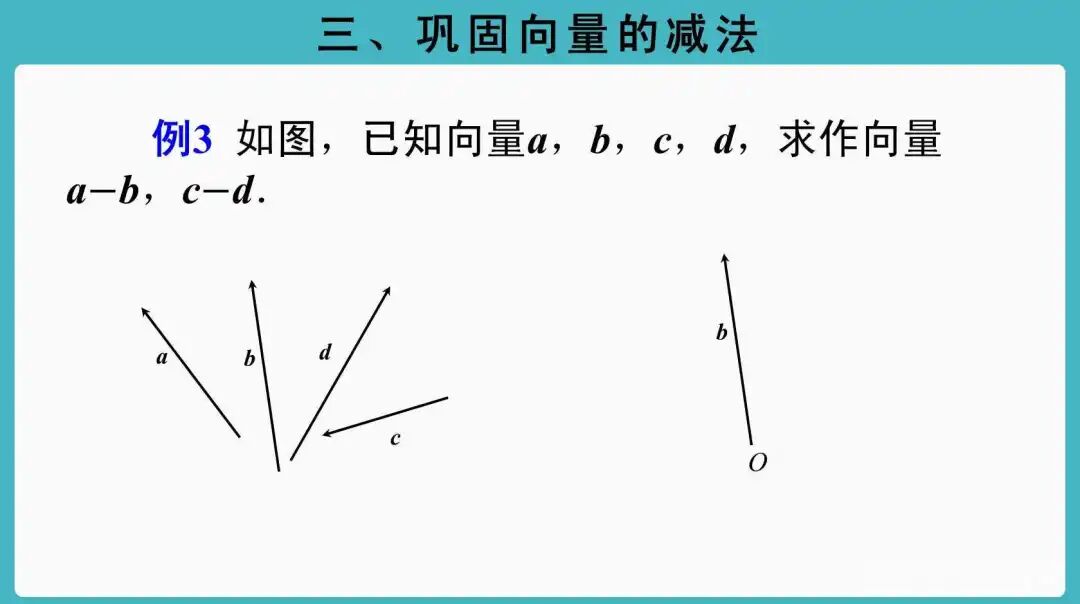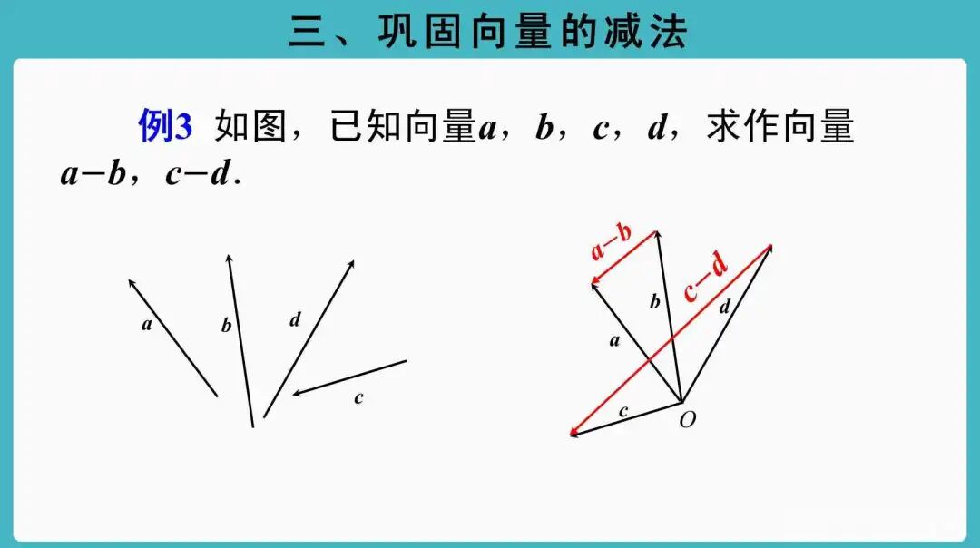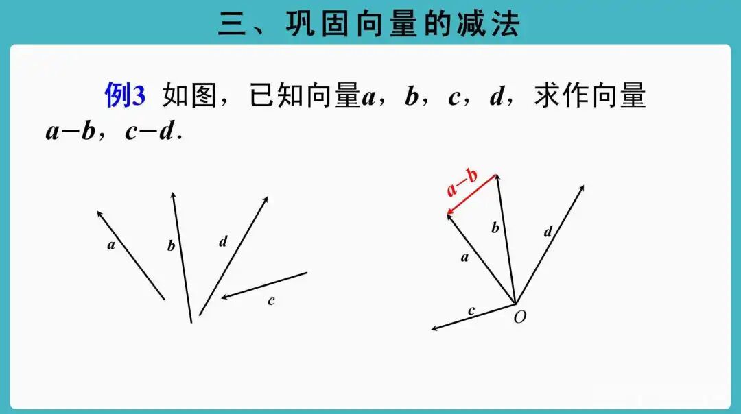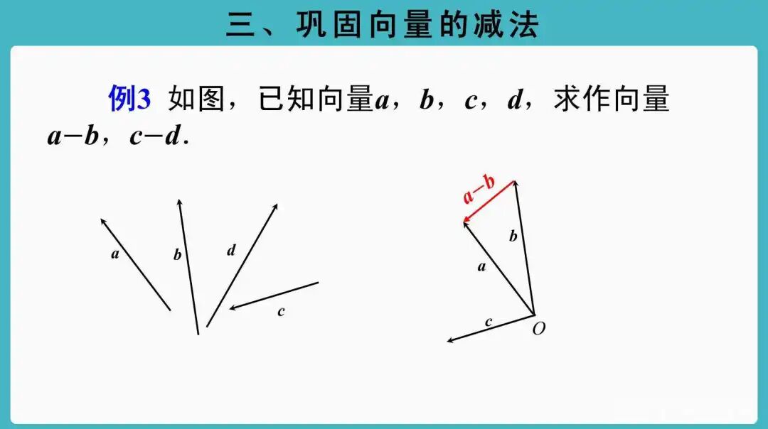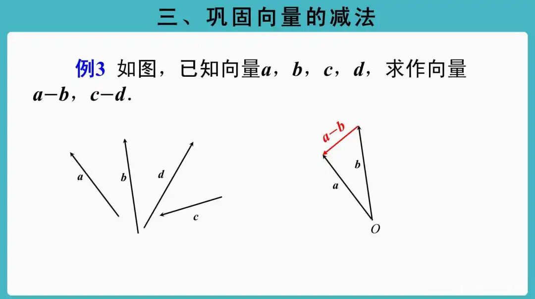 解 连接 AC,DB,由向量求和的平行四边形法则,有=+=a+b; 由减法定义,得=-=a-b. 例2 已知向量 a,b,c与d,求作向量a-b,c-d.