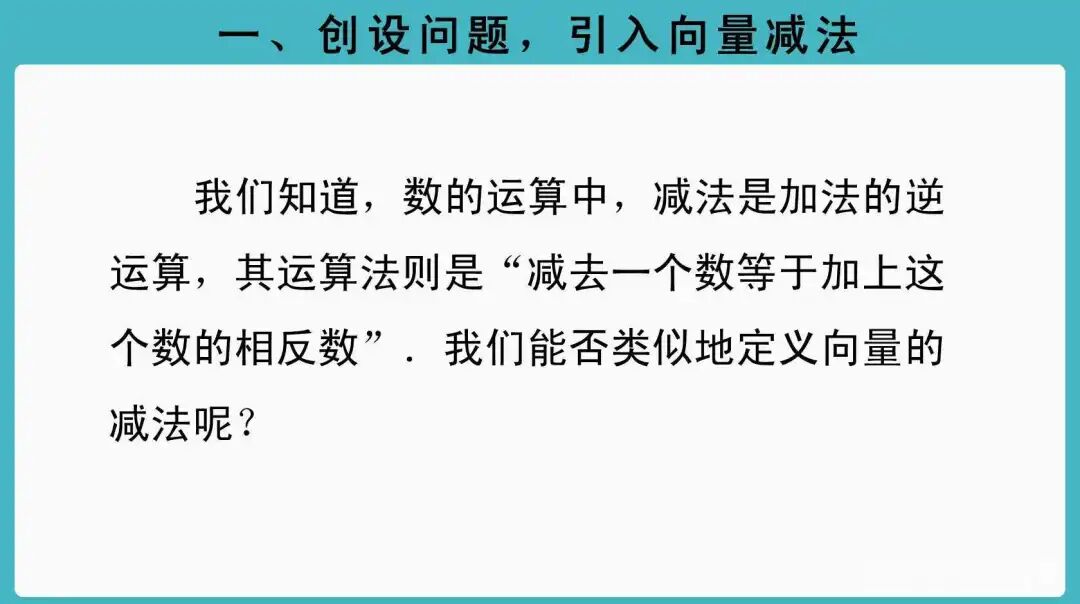 这节课主要采用启发式教学和讲练结合的教学方法.由实例引入,创设问题情境,教师引导学生由向量加法得到向量减法.并在教学过程中始终注重数形结合,对比教学,使问题处于学生思维的最近发展区,较好地培养学生发现问题、提出问题、解决问题的能力.