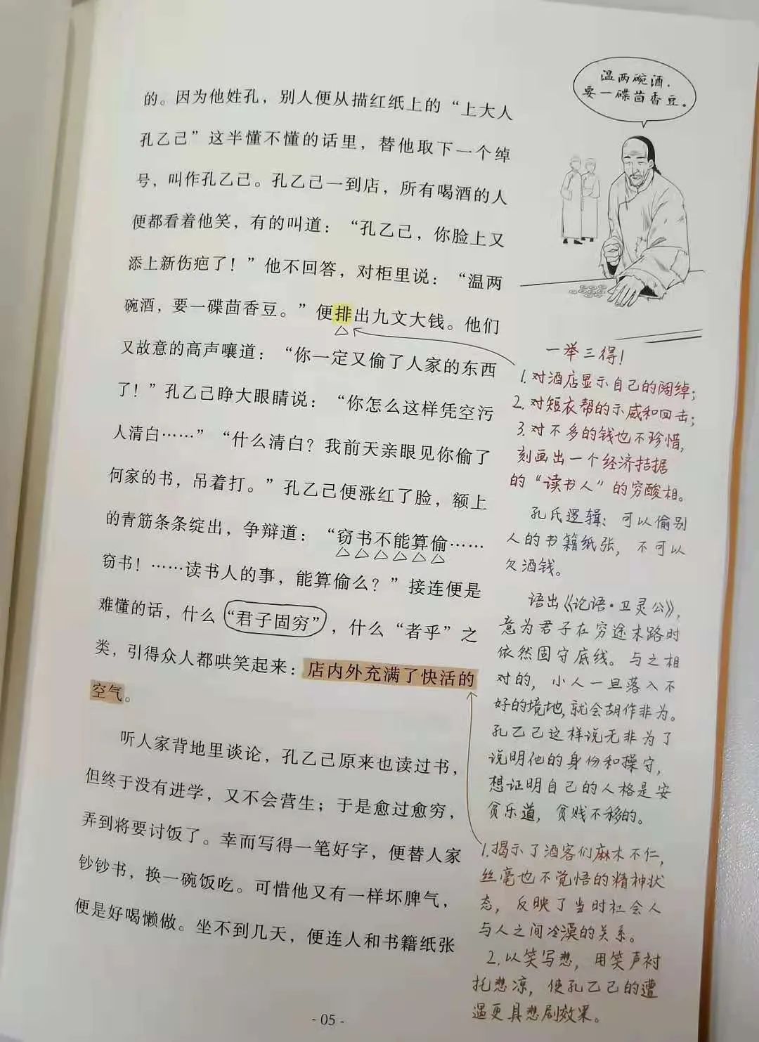 还有《孔乙己》叙述了孔乙己日常生活的几个典型片段,每个片段都抓住了人物的动作细节来描写。