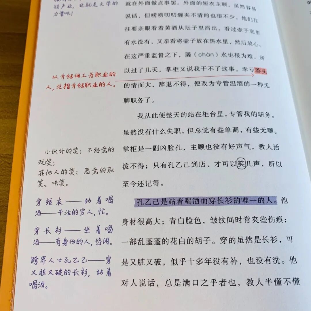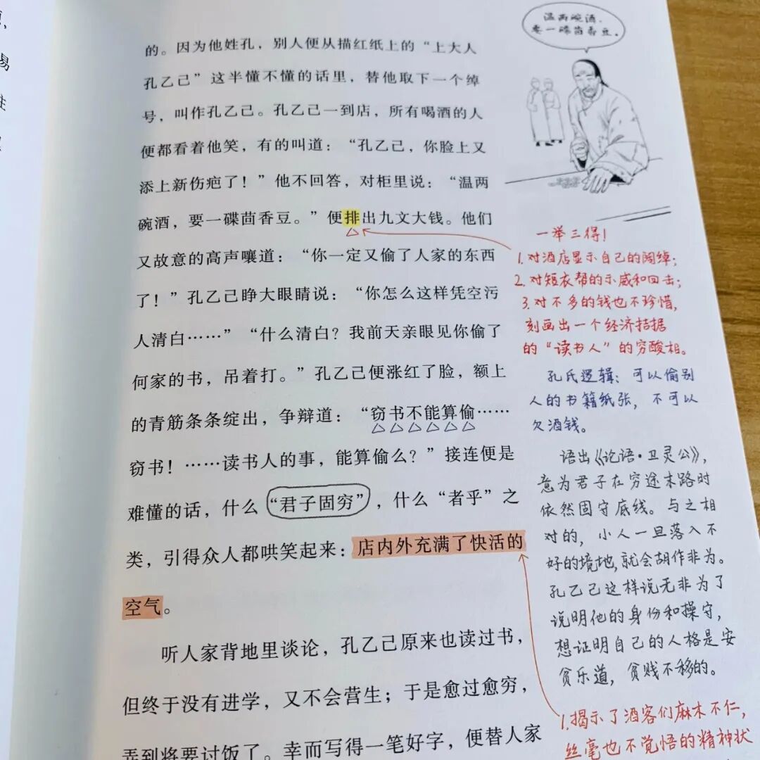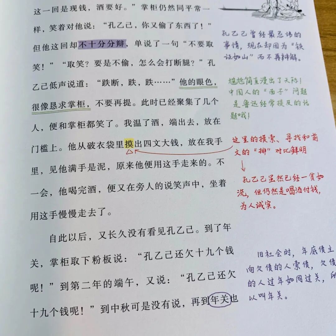 而在最后一次到酒店喝酒时却是“他从破衣袋里摸出四文大钱,放在我手里”,一个“摸”写出了孔乙己每况愈下濒临死亡的境地,与前面的“排”形成鲜明的对比。▼