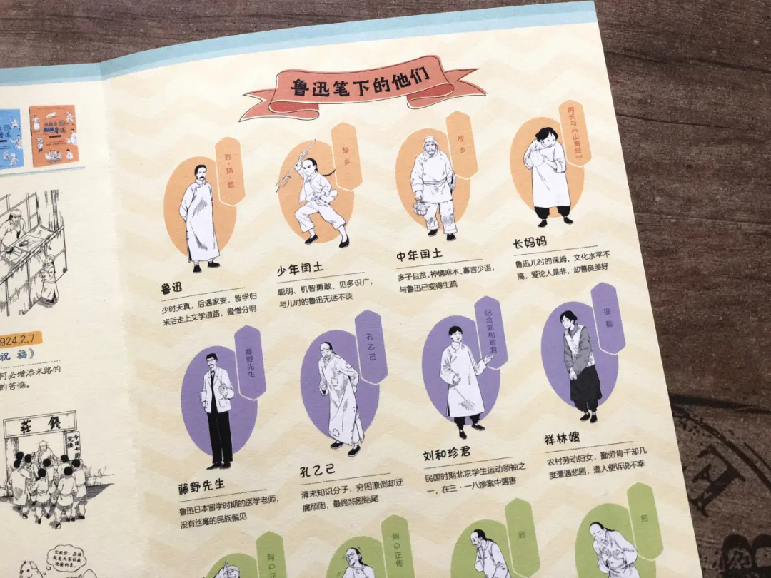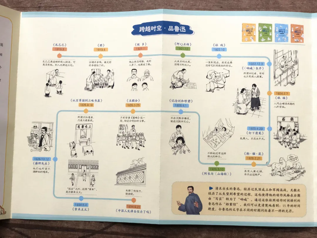 这套书还配了手绘全彩思维导图,以时间为轴,串联起了鲁迅先生的生平。还有手绘漫画小故事,以图说鲁迅的形式,令人物性格鲜活立体地跃然纸上,比如:课本中鲁迅是一个不怒自威、严肃得不能再严肃的人,实际上鲁迅从小就是个顽皮的人。他的祖母刻板严厉,没人敢惹,小鲁迅却偏要老虎头上拔毛。每次从祖母门前经过,鲁迅都假装摔跤,整得老太太紧张兮兮,刚想去拉他,鲁迅却拍拍屁股爬起来,一溜烟儿跑了。有一回老师出对子,上联:独角兽。同桌问迅哥儿怎么对下联,他说:四眼狗。