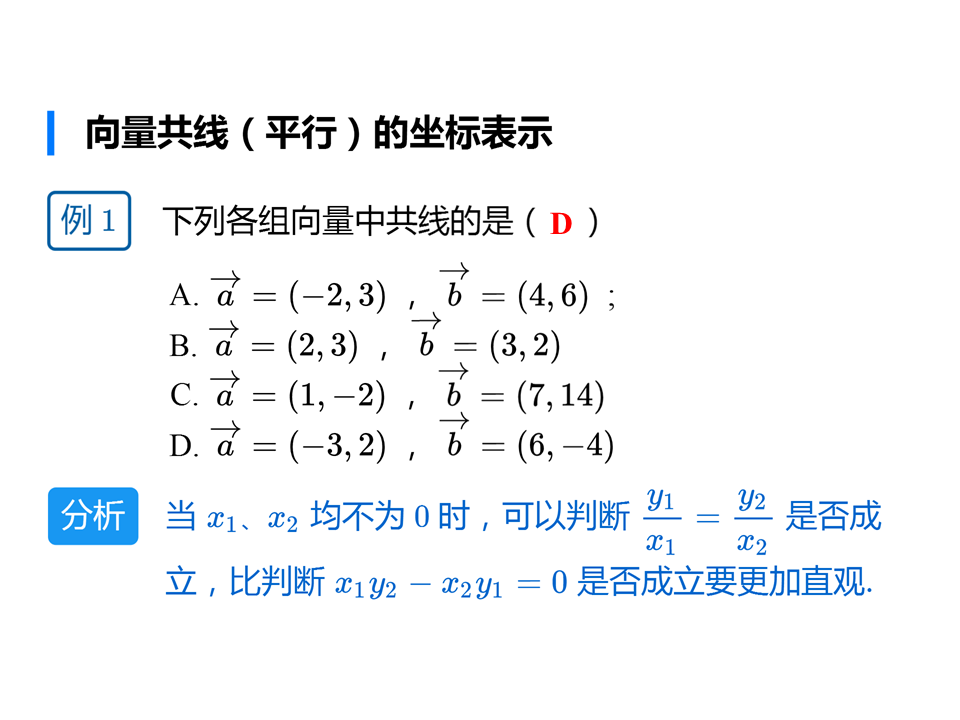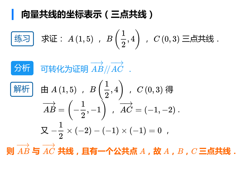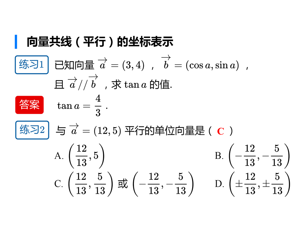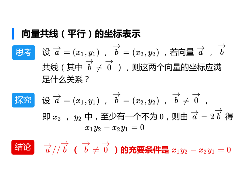 语文数学英语物理化学生物史地政治道德与法治美术音乐科学全部课程 ↓知识点:(一)平面向量的坐标表示(二)平面向量的坐标运算视频教学:练习:1.已知点A(0,1),B(3,2),向量→=(-4,-3),则向量→等于( )A.(-7,-4) B.(7,4)C.(-1,4) D.(1,4)2.已知向量a=(-1,2),b=(1,0),那么向量3b-a的坐标是( )A.(-4,2) B.(-4,-2)C.(4,2) D.(4,-2)3.已知a-12b=(1,2),a+b=(4,-10),则a等于( )A.(-2,-2) B.(2,2)C.(-2,2) D.(2,-2)4.已知向量a=(1,2),b=(2,3),c=(3,4),且c=λ1a+λ2b,则λ1,λ2的值分别为( )A.-2,1 B.1,-2C.2,-1 D.-1,25.已知两点A(4,1),B(7,-3),则与→同向的单位向量是( )A.as4alco1((345) B.as4alco1(-(345)C.as4alco1(-(435) D.as4alco1((435)课件:教案:教材分析:1.内容 平面向量基本定理,平面向量的正交分解与坐标表示,平面向量的加法、减法、数乘和数量积运算的坐标表示. 本单元的知识框图如下: 2.内容解析 平面向量基本定理表明任何一个平面向量a都可以唯一地表示成两个不平行向量的线性组合,即.特殊地,当时,则为正交分解,进而可以借助直角坐标系,用坐标表示向量a. 这是对平面向量的一个基础性、结构性的认识:给定一个点A,以及两个不平行的向量,则可以刻画平面上任意的点P,通过向量的运算,平面上的点P就可以成为“可操纵”的对象.这是用“数”的运算处理“形”的问题,体现了数形结合的思想方法. 通过平面向量基本定理,用向量表示几何问题;结合向量运算;最后将向量问题翻译成几何问题,这是“向量法”解决问题的一般步骤与方法. “平面向量基本定理”的概念和应用,是研究向量的正交分解和向量的坐标运算基础;向量的几何表示与运算是向量的坐标表示与运算的平行概念;而向量的概念、表示与运算则是平面向量基本定理的上位概念. 以向量的线性运算为基础,学习平面向量基本定理,进而学习向量的坐标表示与运算.让学生感悟平面向量是体现“形”与“数”融合的重要载体,感受向量方法的力量. 基于以上分析,可以确定本单元的教学重点:平面向量的基本定理;平面向量运算的坐标表示. 二、目标和目标解析 1.目标 (1)理解平面向量基本定理及其几何意义. (2)掌握平面向量的正交分解及坐标表示. (3)掌握平面向量的加、减运算与数乘运算的坐标表示. (4)掌握平面向量的数量积的坐标表示. 2.目标解析 (1)类比力的合成与分解,将任意一个平面向量唯一地表示成两个不平行向量的线性组合,进而理解平面向量基本定理及其意义. (2)借助平面直角坐标系,理解平面向量的正交分解及坐标表示. (3)知道用坐标表示的平面向量的加、减运算与数乘运算的运算法则,并能熟练进行运算. (4)知道坐标表示的平面向量的数量积的运算法则,并能熟练进行运算. (5)能用坐标表示两个平面向量的夹角;能用坐标表示平面向量共线、垂直的条件. 三、教学问题诊断分析 学生学习了向量的概念以及向量的运算,但在学习平面向量基本定理时仍然会遇到很大的困难,主要体现在三方面: 其一,位于同一直线上的向量可以由位于这条直线上的一个非零向量表示.类似地,平面内任一向量是否可以由同一平面内的两个不共线向量表示呢?这是学习障碍之一,首先,这个问题的提出就不容易,其次,从一维数轴到二维坐标平面,是思维的一个跨越.解决这个问题,可以借助物理中力的分解与合成. 其二,任何一个向量都可以唯一表示成,这涉及对“存在性和唯一性”的认识,对思维要求较高.解决这个问题,可以从两方面入手,一是借助信息技术,动态表示;另一方面需对唯一性给出严格的证明. 其三,用向量方法解决几何问题时,先要用基底表示其他相关向量,进而通过向量运算解决问题,这是一个全新的方法.解决这个问题,需多加练习,做到熟能生巧. 由此,可以确定本单元的教学难点是:平面向量基本定理,用平面向量基本定理解决有关问题.四、教学重点、难点重点:平面向量的基本定理;平面向量运算的坐标表示.难点:平面向量基本定理,用平面向量基本定理解决有关问题.五、数学学科素养数学抽象、逻辑推理、数学运算、直观想象、数学建模。高中生学习推荐:高中语文(微课+课件+教案+考点)汇总高中英语(微课+课件+教案+考点)汇总高中化学(微课+课件+教案+考点)汇总高中物理(微课+课件+教案+考点)汇总高中数学(微课+课件+教案+练习题)汇总高中生物(微课+课件+教案+练习题)汇总高中历史(必修+选修)微课精讲+考点汇总高中政治(必修+选修)微课精讲+考点汇总高中地理(必修+选修)微课精讲+考点汇总图文来自网络,版权归原作者,如有不妥,告知即删点击阅读原文下载全册PPT课件动画教案习题整套资料