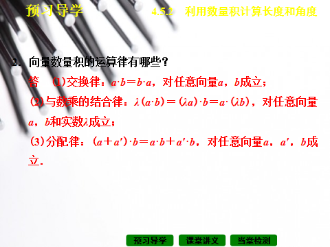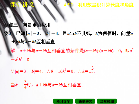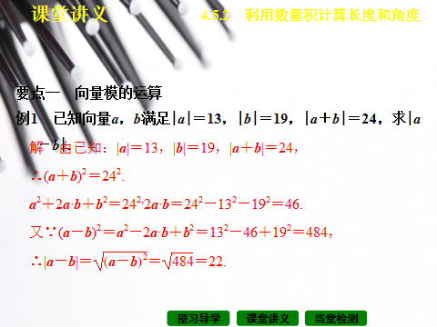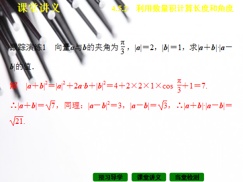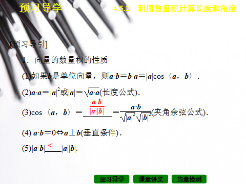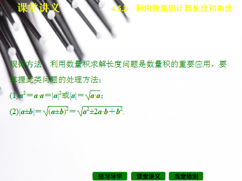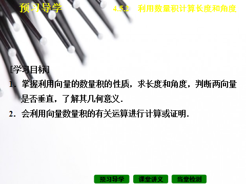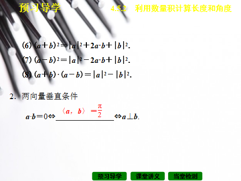 向量的坐标表示与运算可以大大简化数量积的运算,由于有关长度、角度和垂直的问题可以利用向量的数量积来解决,因此可利用向量的坐标求出向量的长度、平面内两点间的距离、两个向量的夹角,可判断两向量是否垂直.