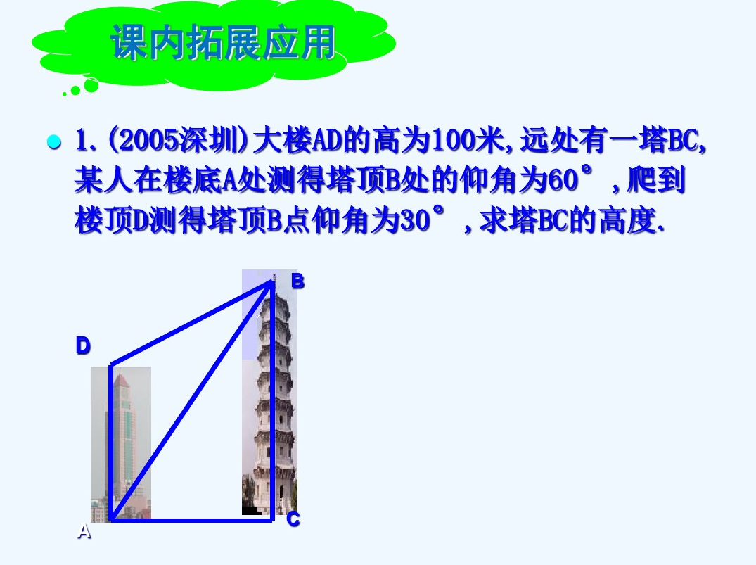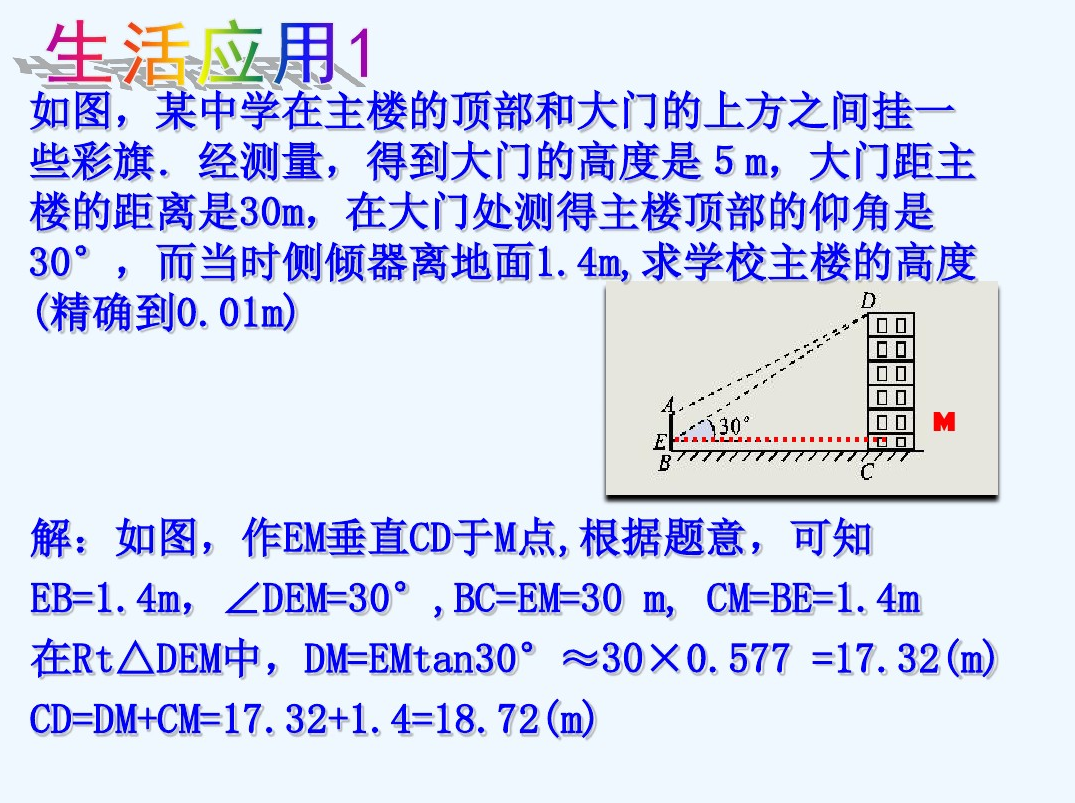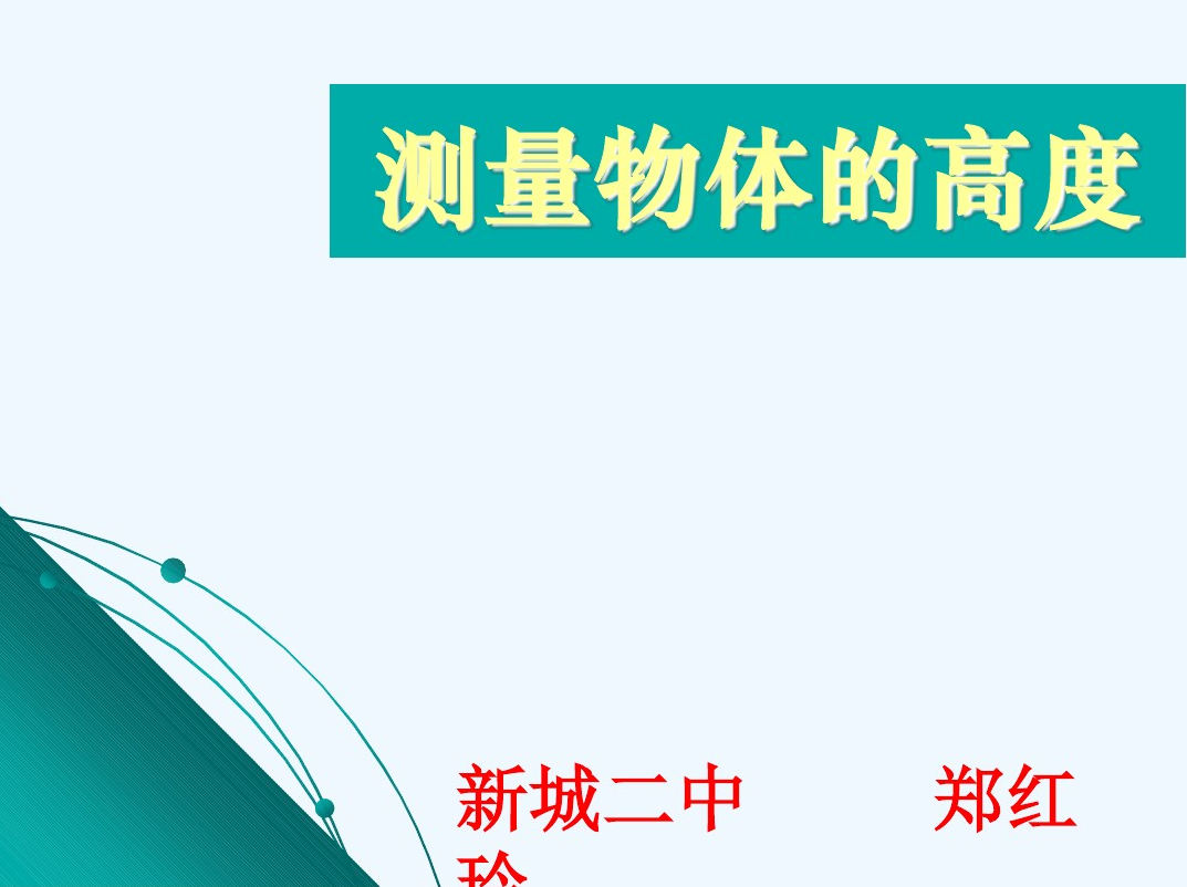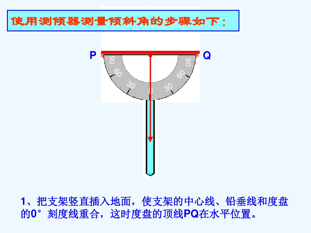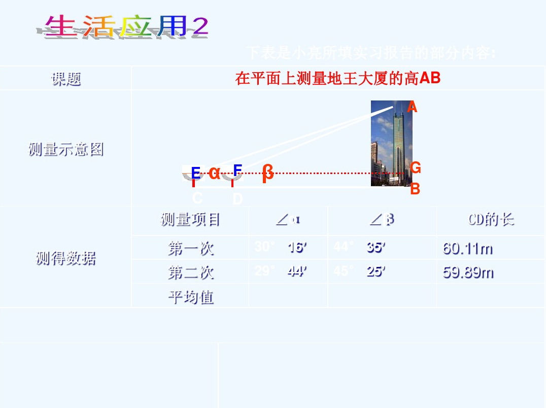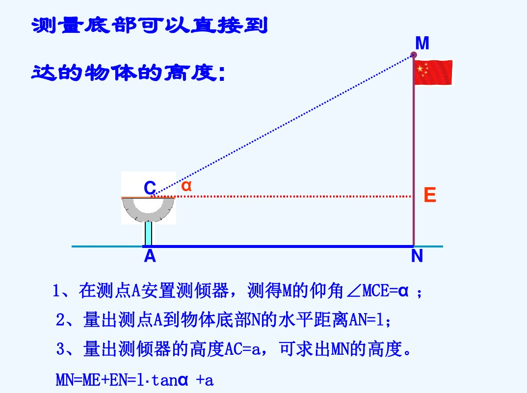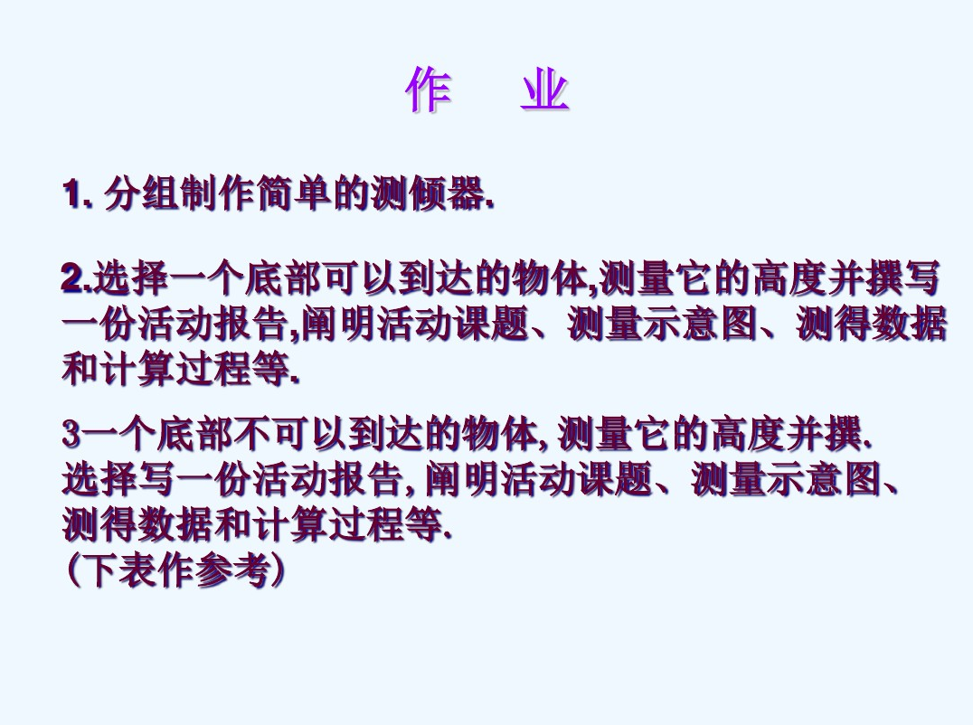 课题研究所要解决的主要问题: 1、测量倾斜角; 2、测量底部可以到达的物体的高度; 3、测量底部不可以到达的物体的高度. 通过以下内容的研究来达成这一目标: 通过以下内容的研究来达成这一目标: 1、先在课堂上讨论、设计方案, 2、进行室外的实际测量,活动结束时,应要求学生写出活动报告.重点是让学生经历设计活动方案、自制仪器或运用仪器进行实地测量以及撰写活动报告的过程.