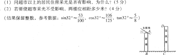 3.某居民小区有一朝向为正南方向的居民楼(如图),该居民楼的一楼是高6米的小区超市,超市以上是居民住房.在该楼的前面15米处要盖一栋高20米的新楼.当冬季正午的阳光与水平线的夹角为32º时,