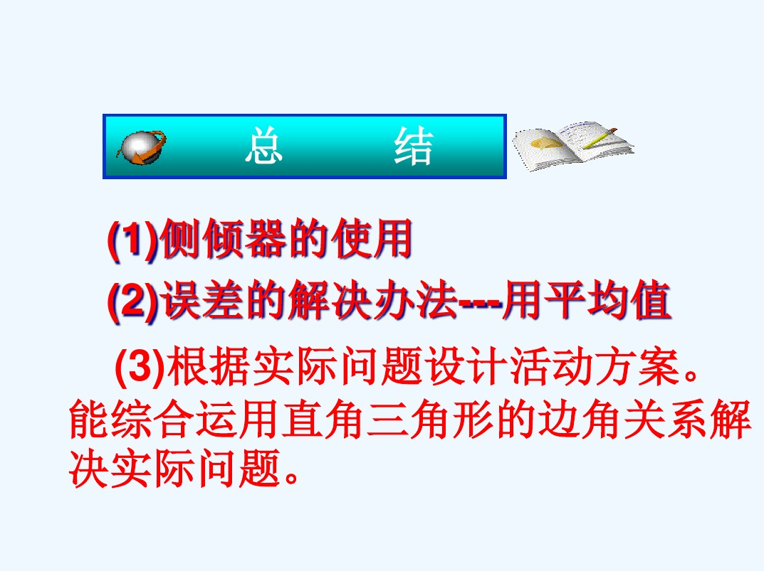 (一)知识与技能 1、经历活动设计方案。 2、经历运用仪器进行实地测量以及撰写活动报告的过程。 3、能利用直角三角形的边角关系的知识解决实际问题。 (二)过程与要求 1.经历活动设计方案,自制仪器. 2.能够设计方案、步骤,能够说明测量的理由. 3.回顾、整理已学过的测高方法以及相关知识.综合运用直角三角形边角关系的知识解决实际问题. 4.经历运用仪器进行实地测量以及撰写活动报告的过程. 5.能够对所得到的数据进行分析,能够对仪器进行调整和对测量结果进行矫正,从而得出符合实际的结果. 6.能综合应用直角三角形的边角关系的知识解决实际问题. 7.能够综合运用直角三角形边角关系的知识解决实际问题,提高解决问题的能力. 8.体会数形之间的联系,逐步学会利用数形结合的思想分析、解决问题. (三)情感与价值观 1.积极参与数学活动过程,并能在活动过程中积极想办法. 2.培养不怕困难的品质,发展合作意识和科学精神. | ||||