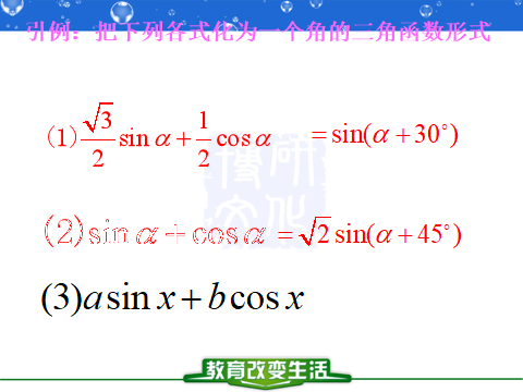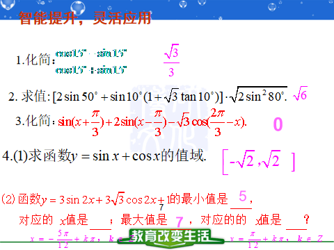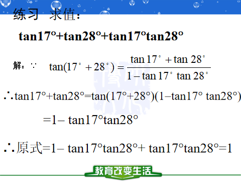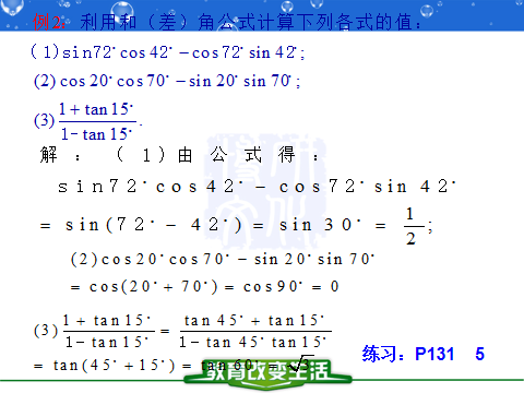 例2. 公式的逆用 利用和(差)角公式计算下列各式的值: (1). (2). ;(3).![]() 练习:求下列各式的值: ![]()