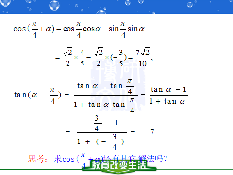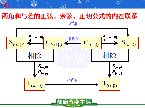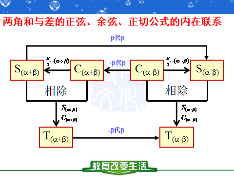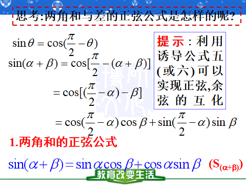 突破措施:学生在前面诱导公式及两角差的余弦公式的基础上,比较自然的推出两角和的余弦公式,以及两角和与差的正弦、正切公式.
