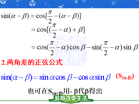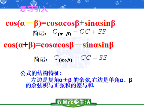 课堂小结 1.方法 由公式 出发推导 , , 的方法. 2.知识:公式及公式的记忆方法 =_______________________________.