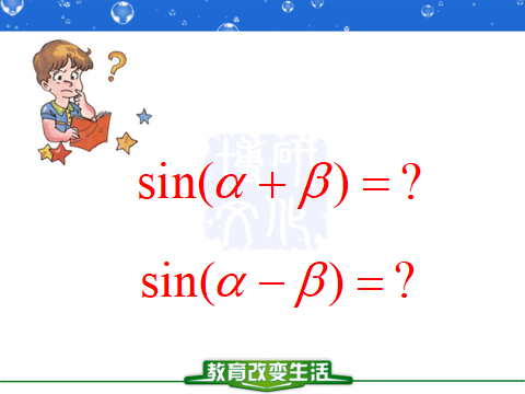 情景导入 有了两角差的余弦公式,我们能解决一些问题,但范围有限,因此自然想得到两角差的正弦、正切公式,以及两角和的正弦、余弦、正切公式,对此,我们将逐个进行探究,让希望成为现实. |