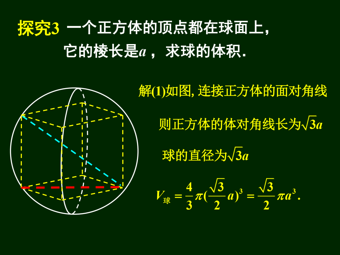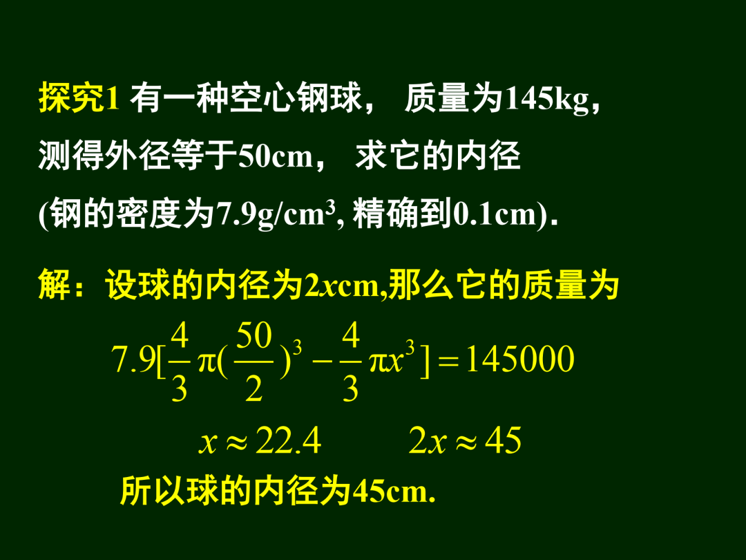 例1. 钢球直径是5cm,求它的体积.(解略)