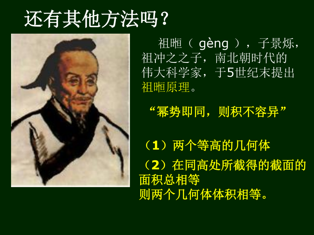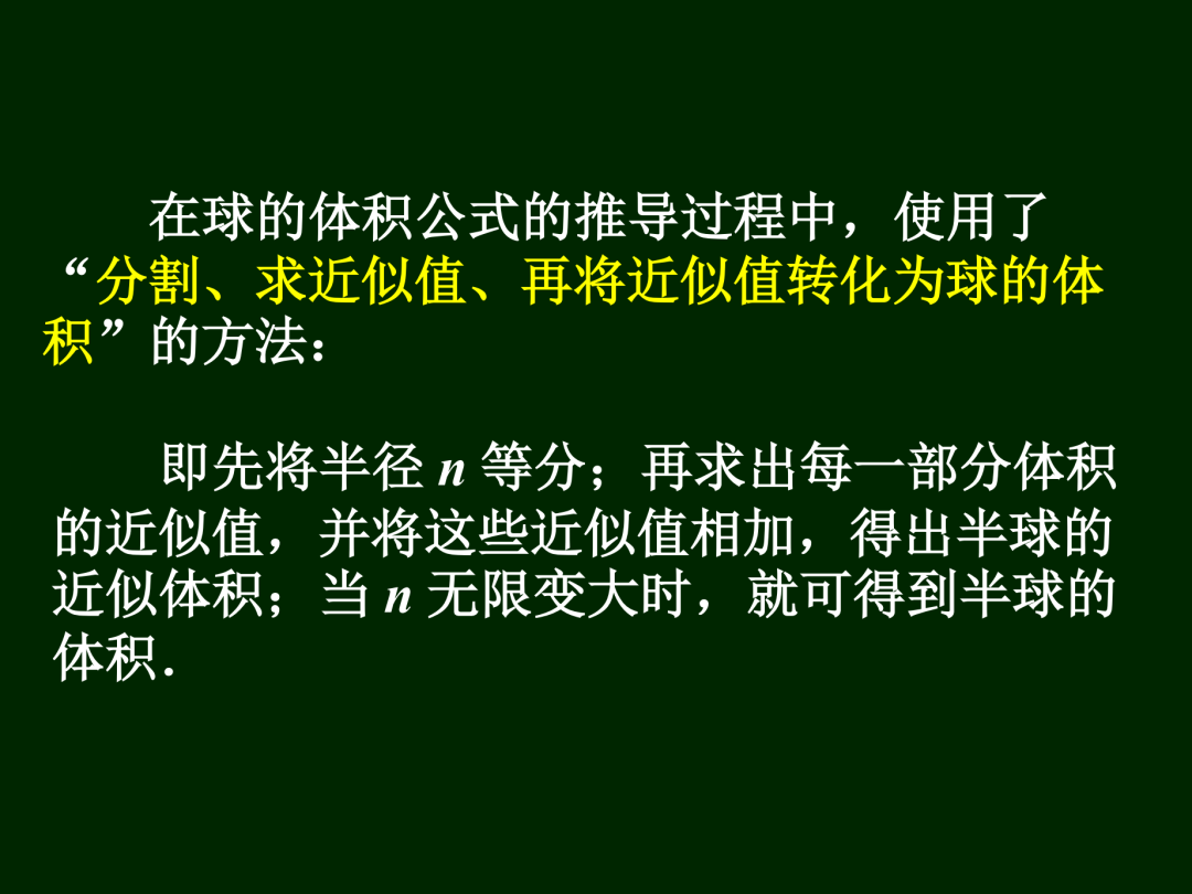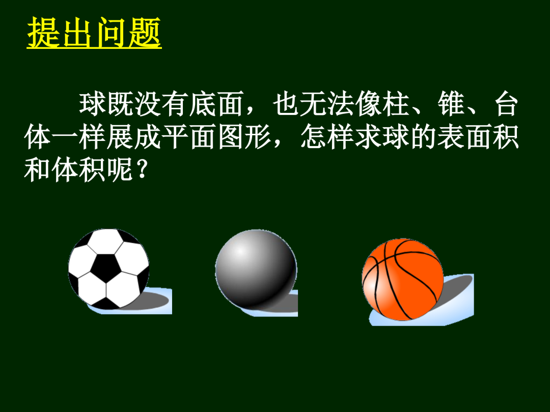 球既没有底面,也无法像在柱体、锥体和台体那样展开成平面图形,它是由半圆围绕直径旋转而成的旋转体,那么如何求球体体积呢?(介绍古今中外研究球体体积的数学文化发展)