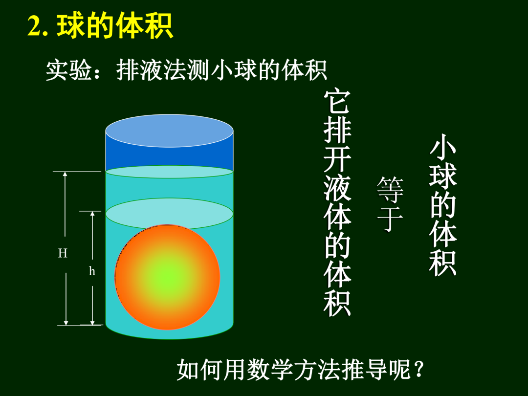 通过数学史发展的角度结合小实验让学生掌握球体的体积和表面积公式,体会数学的美。