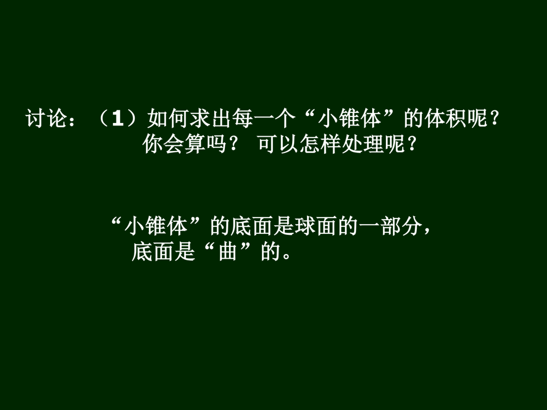 由于学生数学基础差,想象能力较差,球体的分割,极限思想的应用都有一定的难度,因此,在教学中时时降低难度,通过实验导出结论,为引起学生的兴趣,利用动画效果展示和实物模型,积极调动学生参与课堂讨论,实施启发式、探究式课堂。多进行公式应用的练习,达到记忆公式,并会简单应用