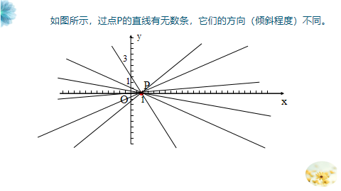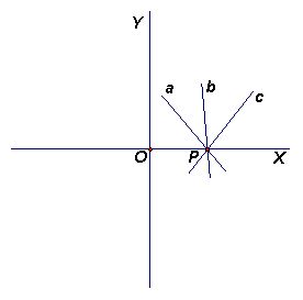 我们知道, 经过两点有且只有(确定)一条直线. 那么, 经过一点P的直线l的位置能确定吗? 如图, 过一点P可以作无数多条直线a,b,c, …易见,答案是否定的.这些直线有什么联系呢?
