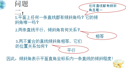 因为平面直角坐标系内的每一条直线都有确定的倾斜程度, 引入直线的倾斜角之后, 我们就可以用倾斜角α来表示平面直角坐标系内的每一条直线的倾斜程度.