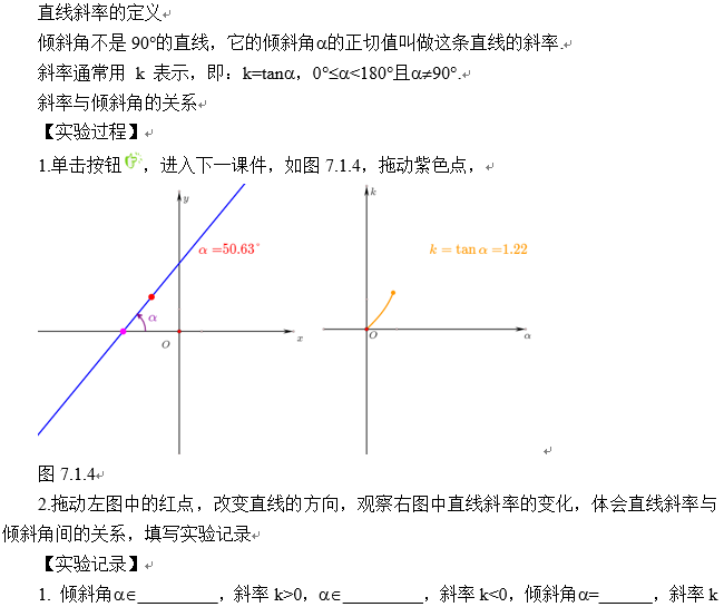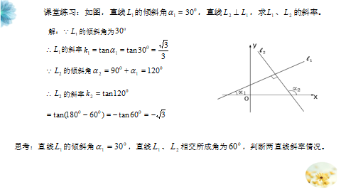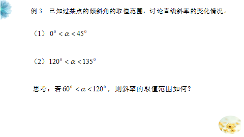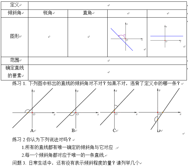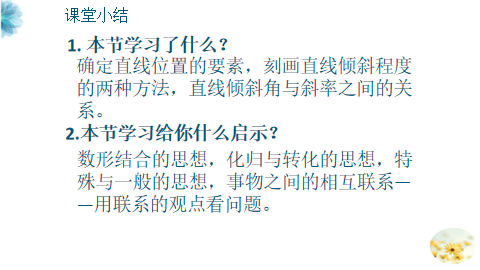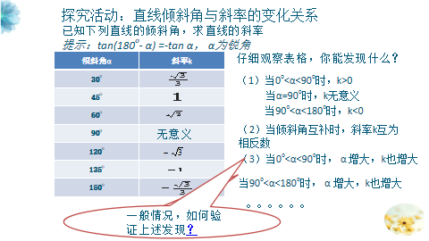 (1) 通过直线的倾斜角概念的引入学习和直线倾斜角与斜率关系的揭示,培养学生观察、探索能力,运用数学语言表达能力,数学交流与评价能力.