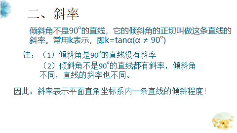 一条直线的倾斜角α(α≠90°)的正切值叫做这条直线的斜率,斜率常用小写字母k表示,也就是