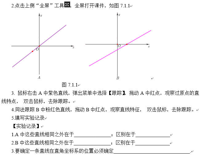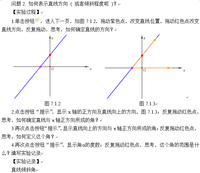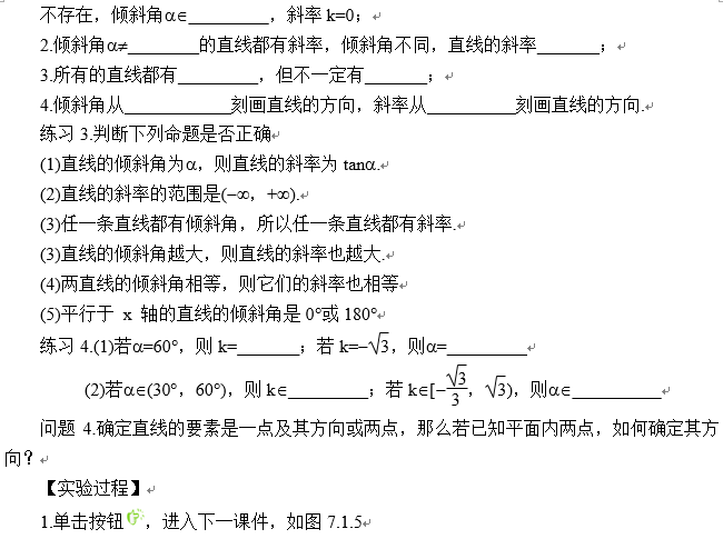 (2)正确理解直线倾斜角和斜率概念.理解每条直线的倾斜角是唯一的,但不是每条直线都存在斜率.(3)理解公式的推导过程,掌握过两点的直线的斜率公式.(4)通过直线倾斜角概念的引入和直线倾斜角与斜率关系的揭示,培养学生观察、探索能力,运用数学语言表达能力,数学交流与评价能力.(5)通过斜率概念的建立和斜率公式的推导,帮助学生进一步理解数形结合思想,培养学生树立辩证统一的观点,培养学生形成严谨的科学态度和求简的数学精神.(1)知识结构本节内容首先根据一次函数与其图像——直线的关系导出直线方程的概念;其次为进一步研究直线,建立了直线倾斜角的概念,进而建立直线斜率的概念,从而实现了直线的方向或者说直线的倾斜角这一直线的几何属性向直线的斜率这一代数属性的转变;最后推导出经过两点的直线的斜率公式.这些充分体现了解析几何的思想方法.①本节的重点是斜率的概念和斜率公式.直线的斜率是后继内容展开的主线,无论是建立直线的方程,还是研究两条直线的位置关系,以及讨论直线与二次曲线的位置关系,直线的斜率都发挥着重要作用.因此,正确理解斜率概念,熟练掌握斜率公式是学好这一章的关键.②本节的难点是对斜率概念的理解.学生对于用直线的倾斜角来刻画直线的方向并不难接受,但是,为什么要定义直线的斜率,为什么把斜率定义为倾斜角的正切两个问题却并不容易接受.(1)本节课的教学任务有三大项:倾斜角的概念、斜率的概念和斜率公式.学生思维也对应三个高潮:倾斜角如何定义、为什么斜率定义为倾斜角的正切和斜率公式如何建立.相应的教学过程 也有三个阶段①在教学中首先是创设问题情境,然后通过讨论明确用角来刻画直线的方向,如何定义这个角呢,学生在讨论中逐渐明确倾斜角的概念.②本节的难点是对斜率概念的理解.学生认为倾斜角就可以刻画直线的方向,而且每一条直线的倾斜角是唯一确定的,而斜率却不这样.学生还会认为用弧度制表示倾斜角不是一样可以数量化吗.再有,为什么要用倾斜角的正切定义斜率,而不用正弦、余弦或余切哪?要解决这些问题,就要求教师帮助学生认识到在直线的方程中体现的不是直线的倾斜角,而是倾斜角的正切,即直线方程(一次函数的形式,下同)中x的系数恰好就是直线倾斜角的正切.为了便于学生更好的理解直线斜率的概念,可以借助几何画板设计:运用上述正反两种变化的动态演示充分揭示直线方程中系数与倾斜角正切的内在关系,这对帮助学生理解斜率概念是极有好处的.③在进行过两点的斜率公式推导的教学中要注意与前后知识的联系,课前要对平面向量,三角函数等有关内容作一定的复习准备.④在学习直线方程的概念时要通过举例清晰地指出两个条件,最好能用充要条件叙述直线方程的概念,强化直线与相应方程的对应关系.为将来学习曲线方程做好准备.(2)本节内容在教学中宜采用启发引导法和讨论法,设计为启发、引导、探究、评价的教学模式.学生在积极思维的基础上,进行充分的讨论、争辩、交流、和评价.倾斜角如何定义、为什么斜率定义为倾斜角的正切和斜率公式的建立,这三项教学任务都是在讨论、交流、评价中完成的.在此过程中学生的思维和能力得到充分的发展.教师的任务是创设问题情境,引发争论,组织交流,参与评价.(1)了解直线方程的概念,正确理解直线倾斜角和斜率概念.(2)理解公式的推导过程,掌握过两点的直线的斜率公式.(3)培养学生观察、探索能力,运用数学语言表达能力,数学交流与评价能力.(4)帮助学生进一步理解数形结合思想,培养学生树立辩证统一的观点,培养学生形成严谨的科学态度和求简的数学精神.