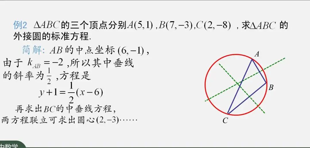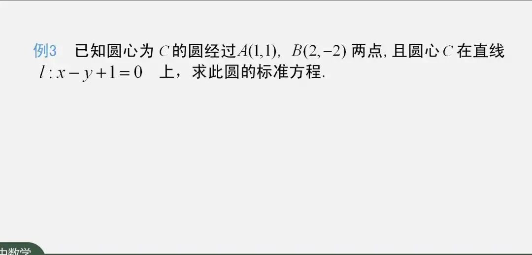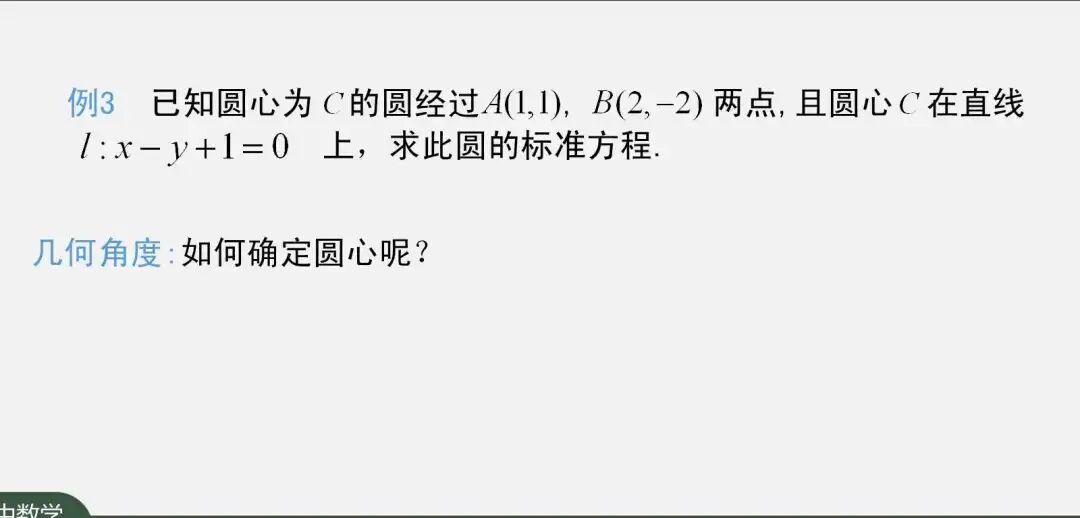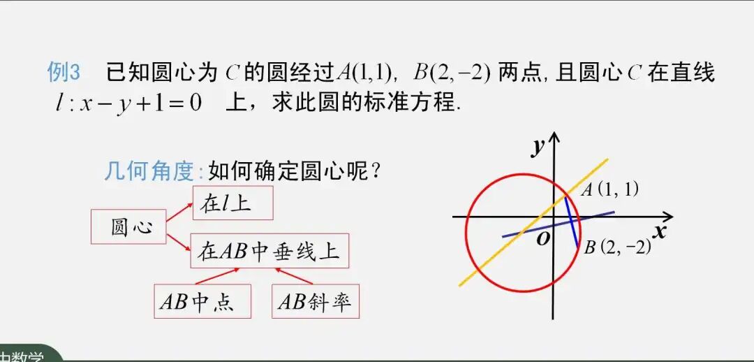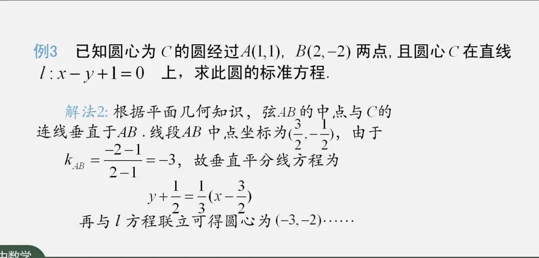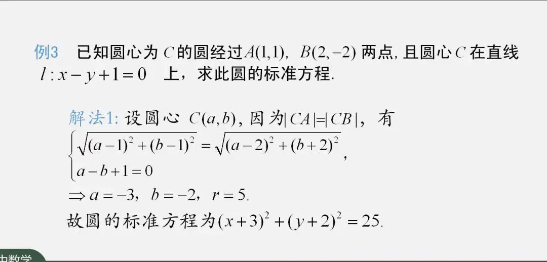 师:本例中半径是已知的,需要我们先求出圆心,也就是两条直线的交点,怎么求? 学生回答后,教师指导学生完成.