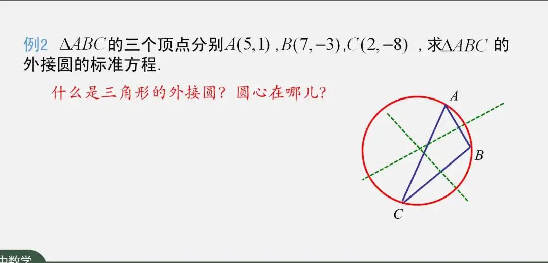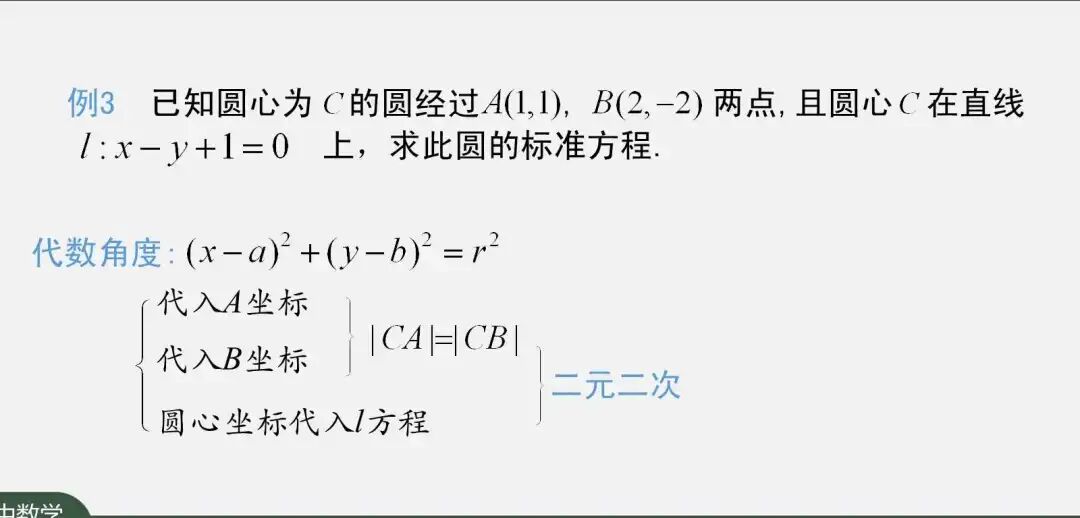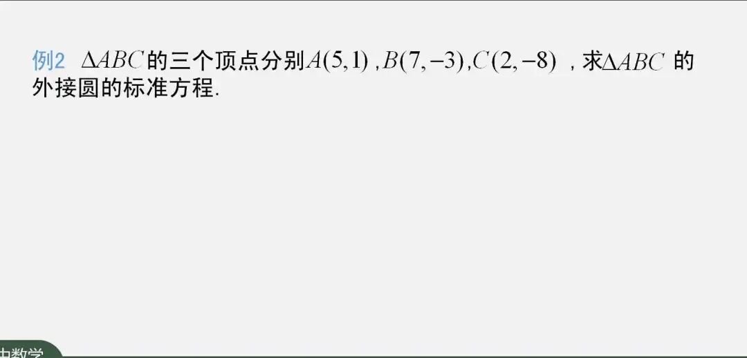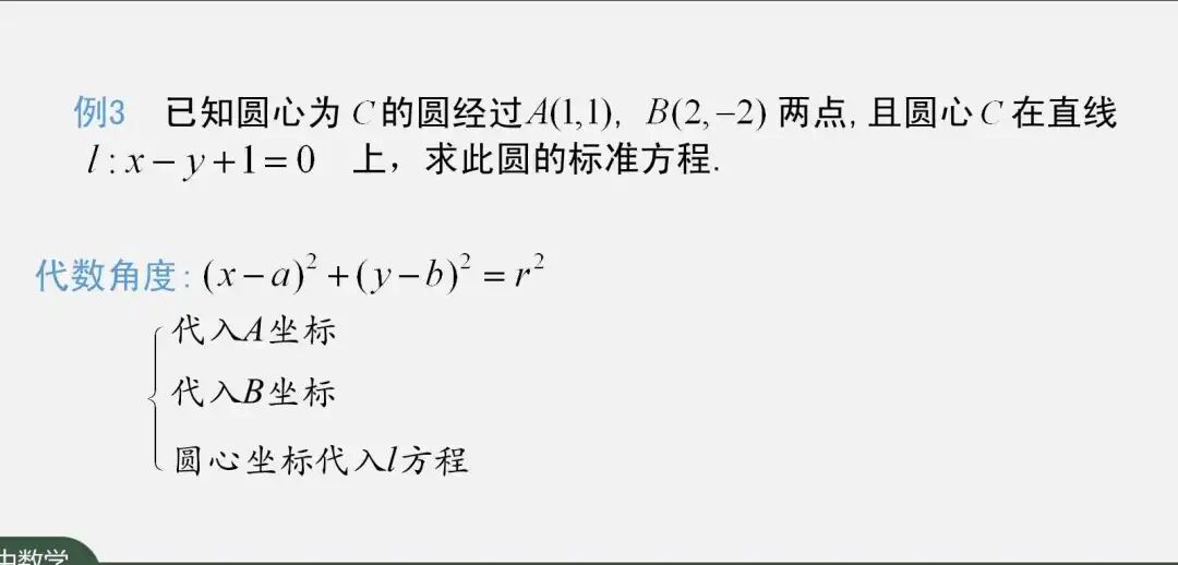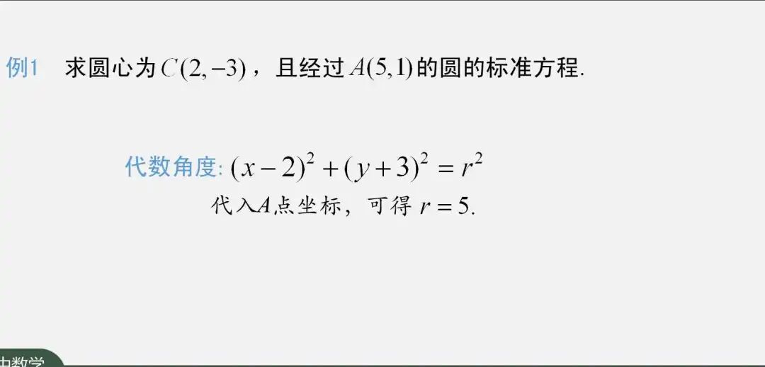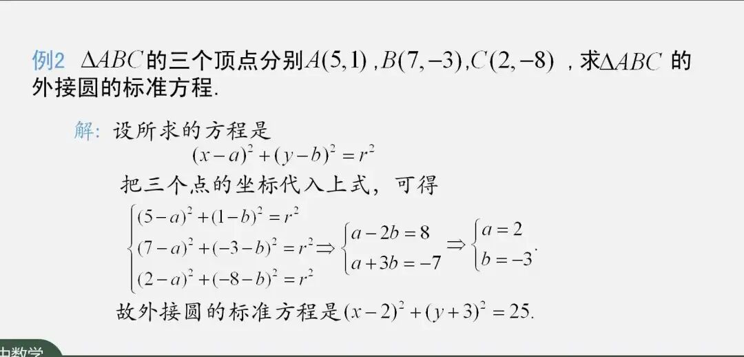 师:本例中半径是已知的,需要我们先求出圆心,也就是两条直线的交点,怎么求? 学生回答后,教师指导学生完成.