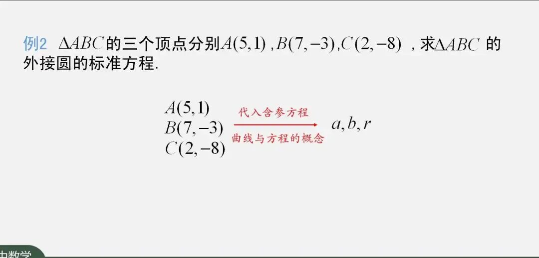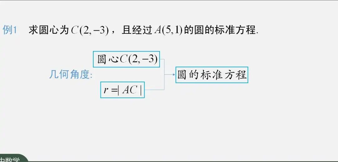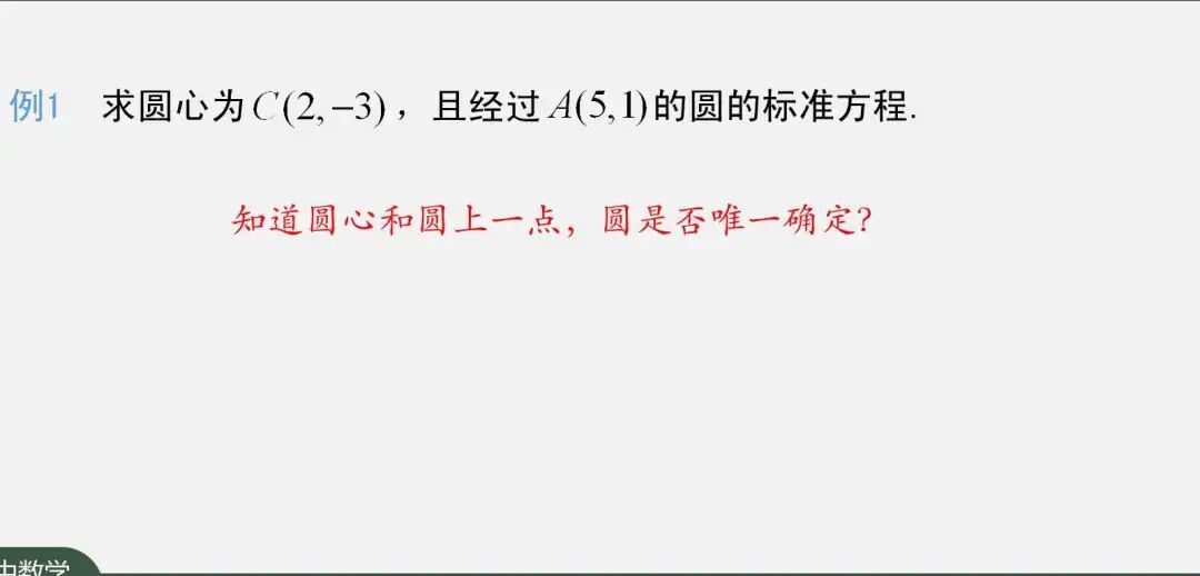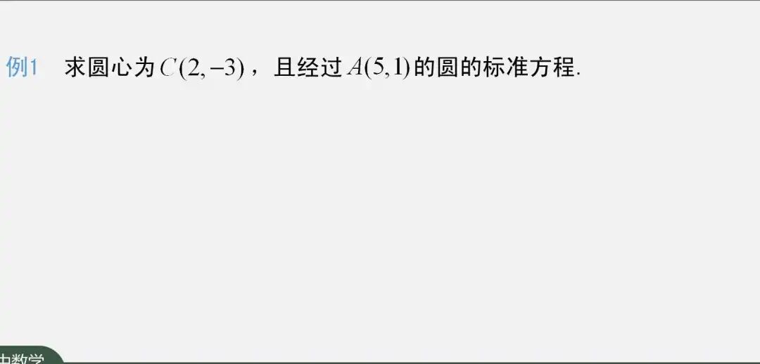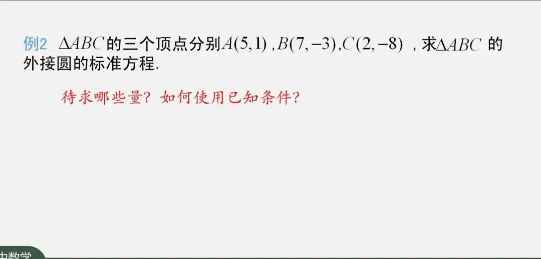 师:求一个圆的标准方程需要知道哪几个量?本例中,哪些量是已知的?需要我们求什么?怎么求? 学生回答,教师点评后,让学生解答本题.