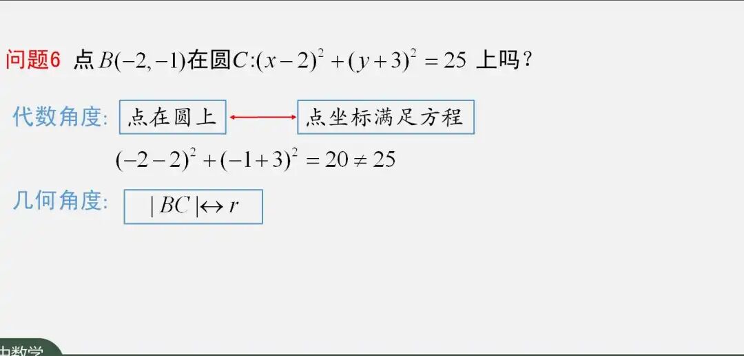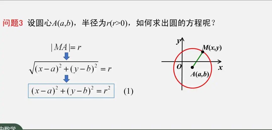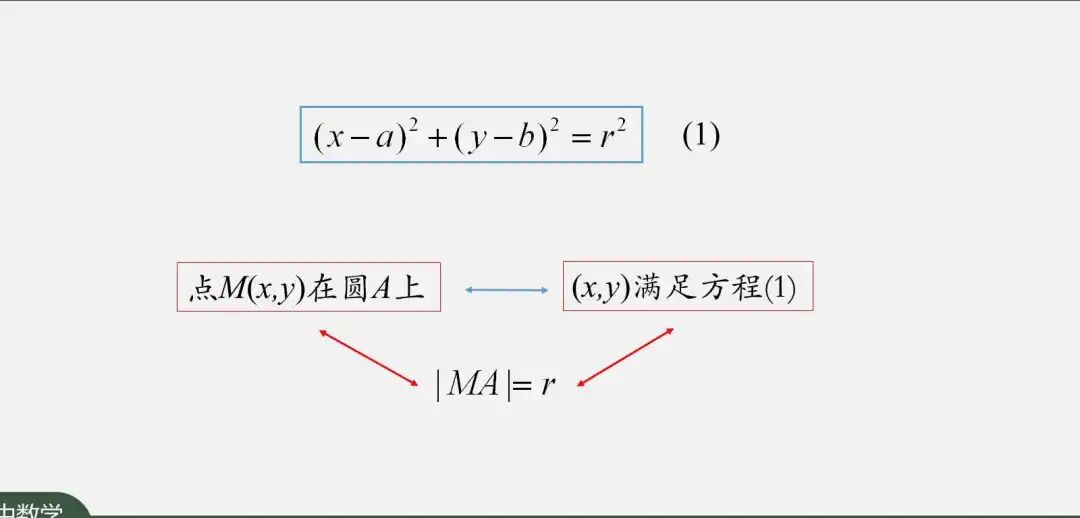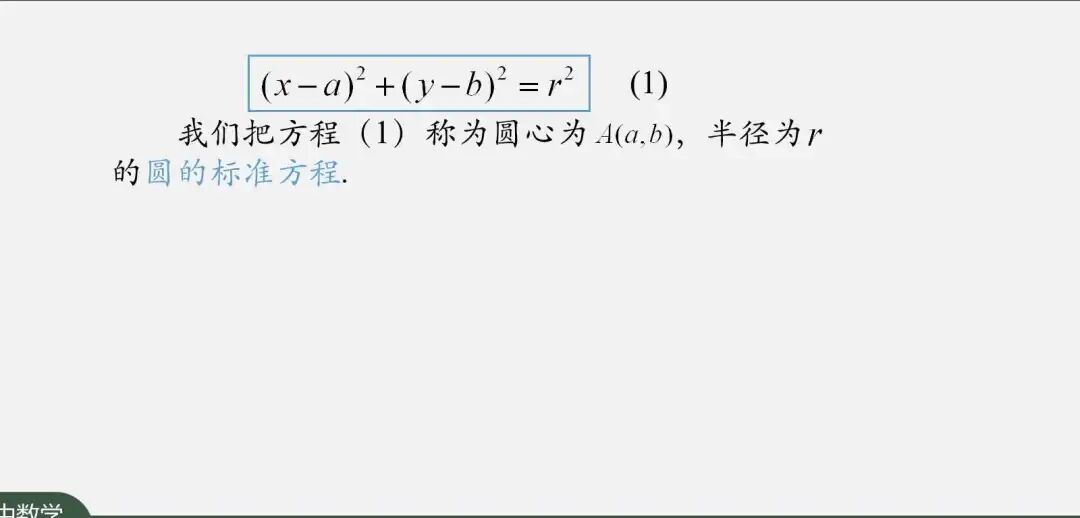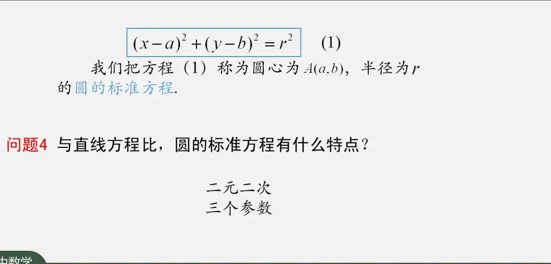 (3)圆的标准方程显示了圆心为(a,b),半径为r这一几何性质,即(x-a)²+(y-b)²=r²----圆心为(a,b),半径为r.
