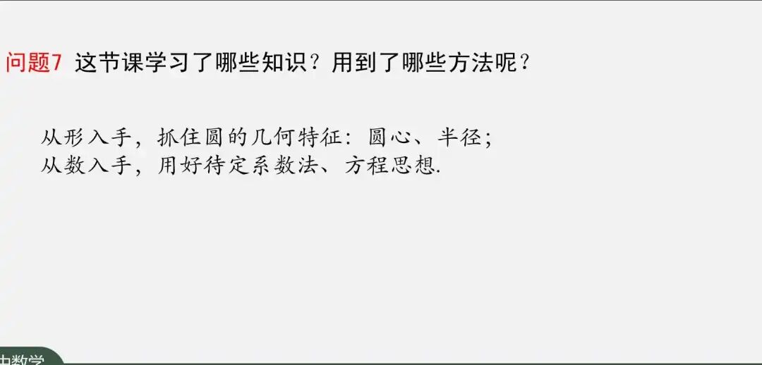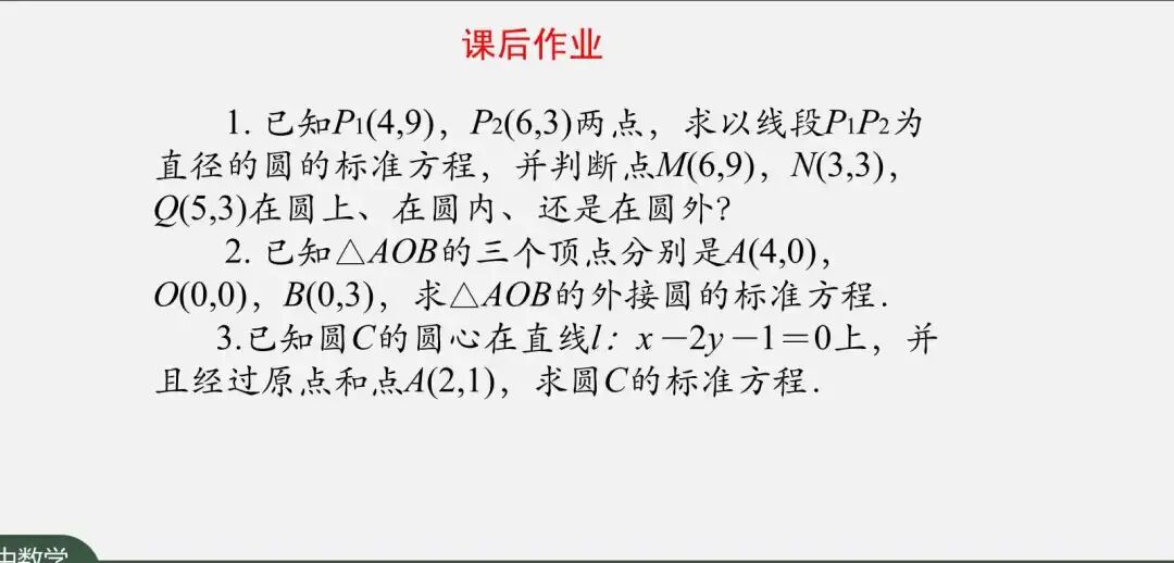 这节课主要采用讲练结合的方法.首先复习圆的定义,在定义的基础上,推导了圆的标准方程.最后通过例题,学习了圆的标准方程的应用.